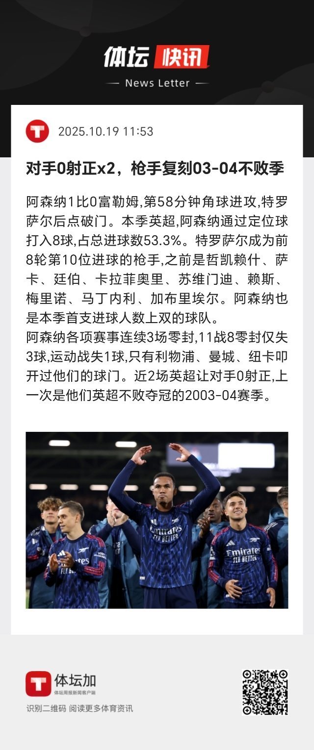 阿森纳连续2场英超让对手0射正,上一次是他们英超不败夺冠的2003-04赛季。