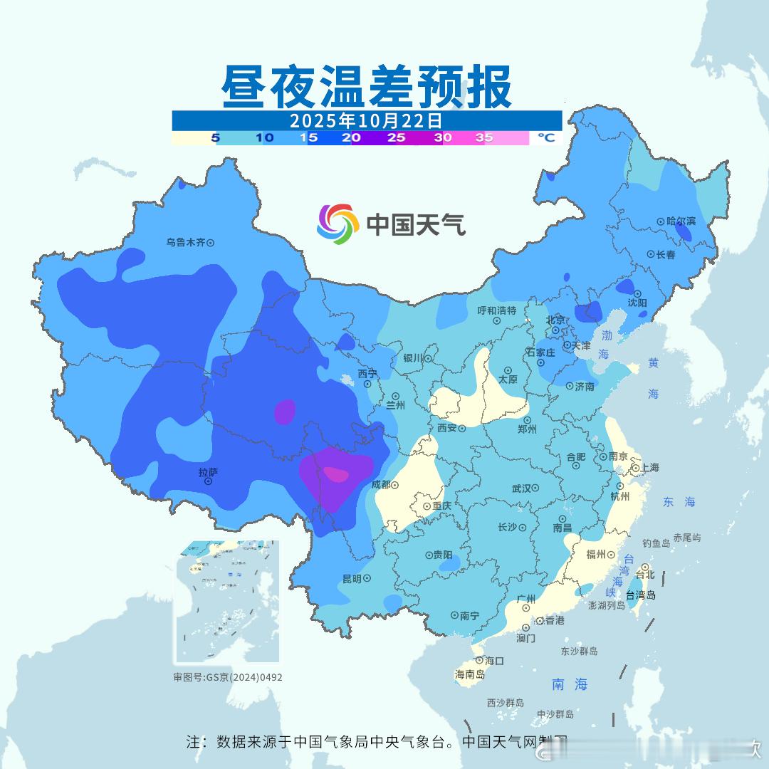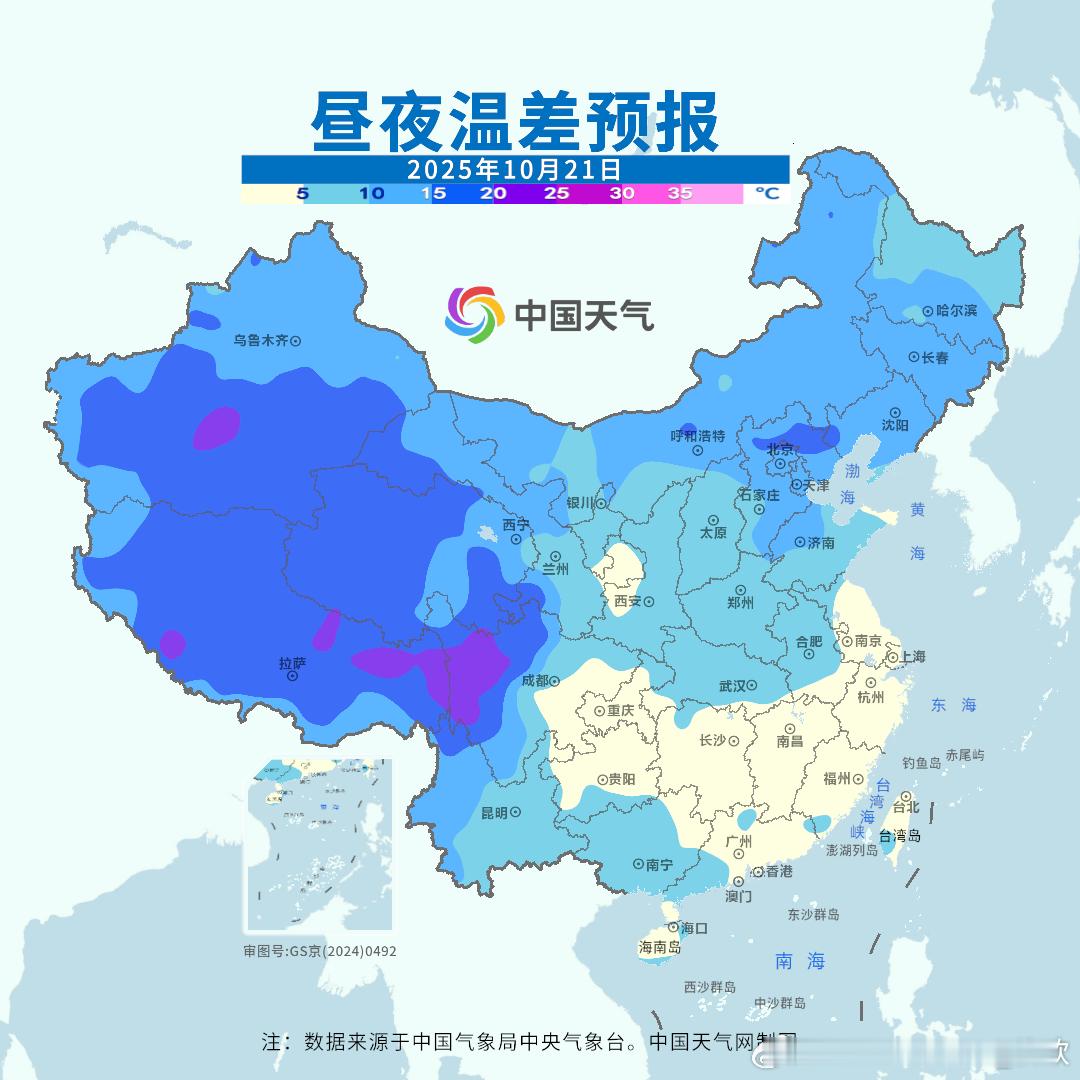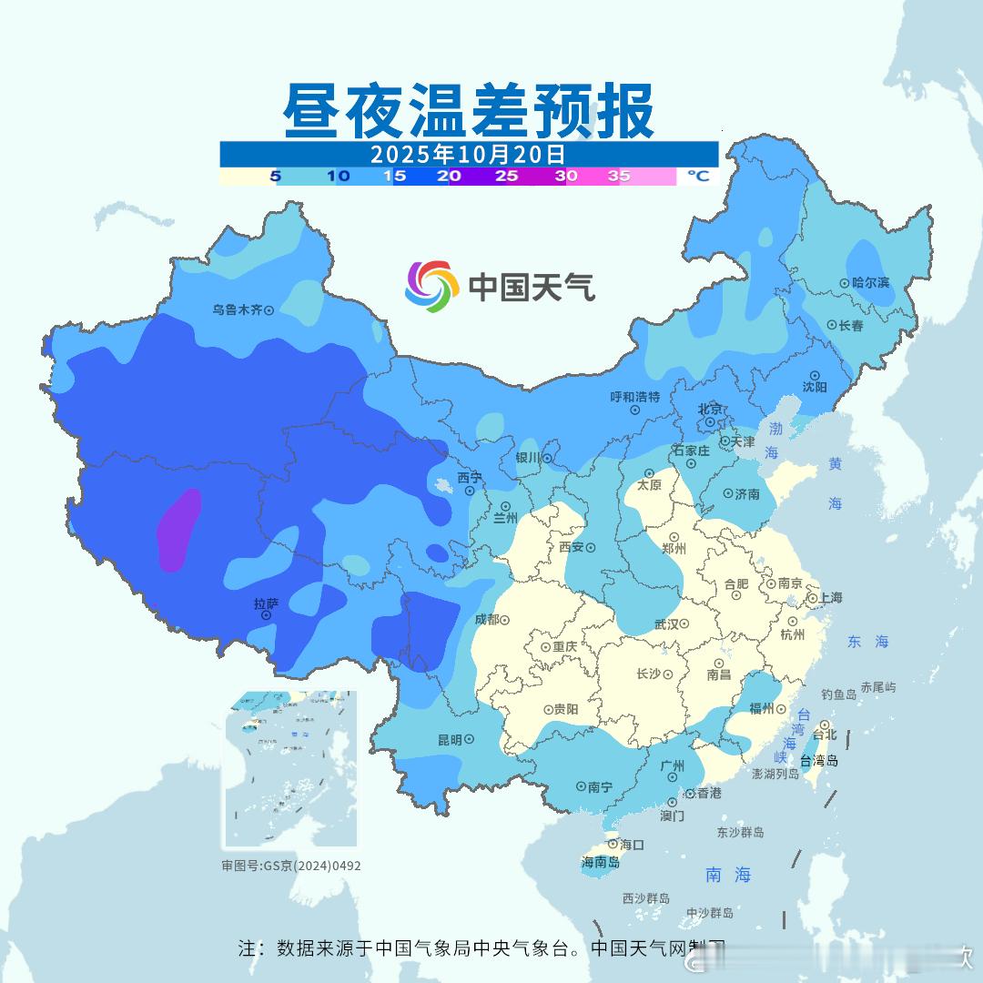 【气温】今天国家级气象站没有35℃以上高温,云南元阳34.3℃最高。未来2天,黄河以南多地气温可能还有下滑。而东北华北白天的气温开始回升,但是明晨东北华北多地的最低气温可能还会创新低。20-22日南方多地最低气温也会不断创新低,但22日白天南方开始升温。总之,未来北方和南方都会经历昼夜温差拉大的过程。