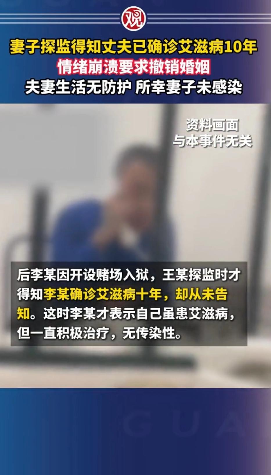 妻子探监时才得知丈夫已确诊艾滋病10年。俩人夫妻生活从未做任何过防护! 云南的王某和丈夫李某结婚多年没孩子,李某一直谎称自己得的是肝病在服药。 李某跟王某说自己有肝病,这也是王某对丈夫李某每天吃药,从未怀疑过! 如果不是犯事坐监,才得知丈夫李某身患az恐怕王某还被蒙在鼓里! 李某可恶,深知自己患病有意隐瞒不说,过夫妻生活还不做保护措施,这就是故意为之了! 结果李某因为开赌场入狱,王某探监才知道他确诊艾滋病都十年了,而且俩人夫妻生活从没做过防护。 还好王某没被感染,但精神压力肯定大到爆。 说王某运气好吧,遇到这种男人,让自己在十年婚姻里承受那么多次被感染的风险! 说她运气不好吧,十年婚姻没有任何防护,却躲过传染!何其幸运! 王某起诉撤销婚姻,法院也判了,这婚姻就相当于从没存在过。 结婚前重大疾病得如实告知,这男的隐瞒十年,妥妥的欺诈。 而且按法律,明知有艾滋还无防护发生关系,最高能判故意伤害罪。 这男的太自私可恶,希望大家在婚姻里都能坦诚,别让这种糟心事再发生。
