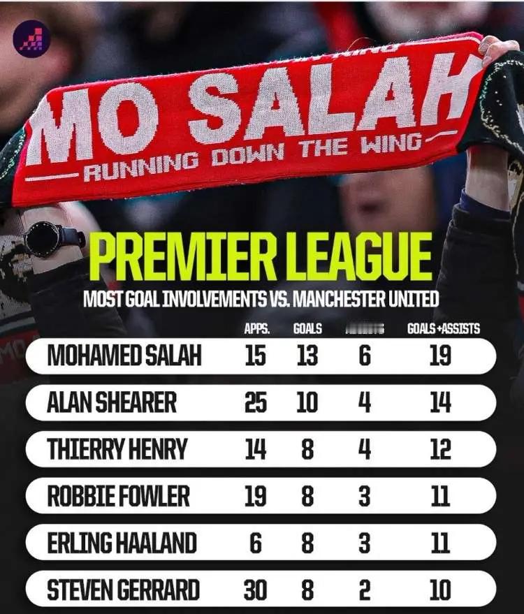 Squawka统计了球员在英超对阵曼联参与进球数量排行榜,他们是利物浦、阿森纳、切尔西、曼城、纽卡的射手。