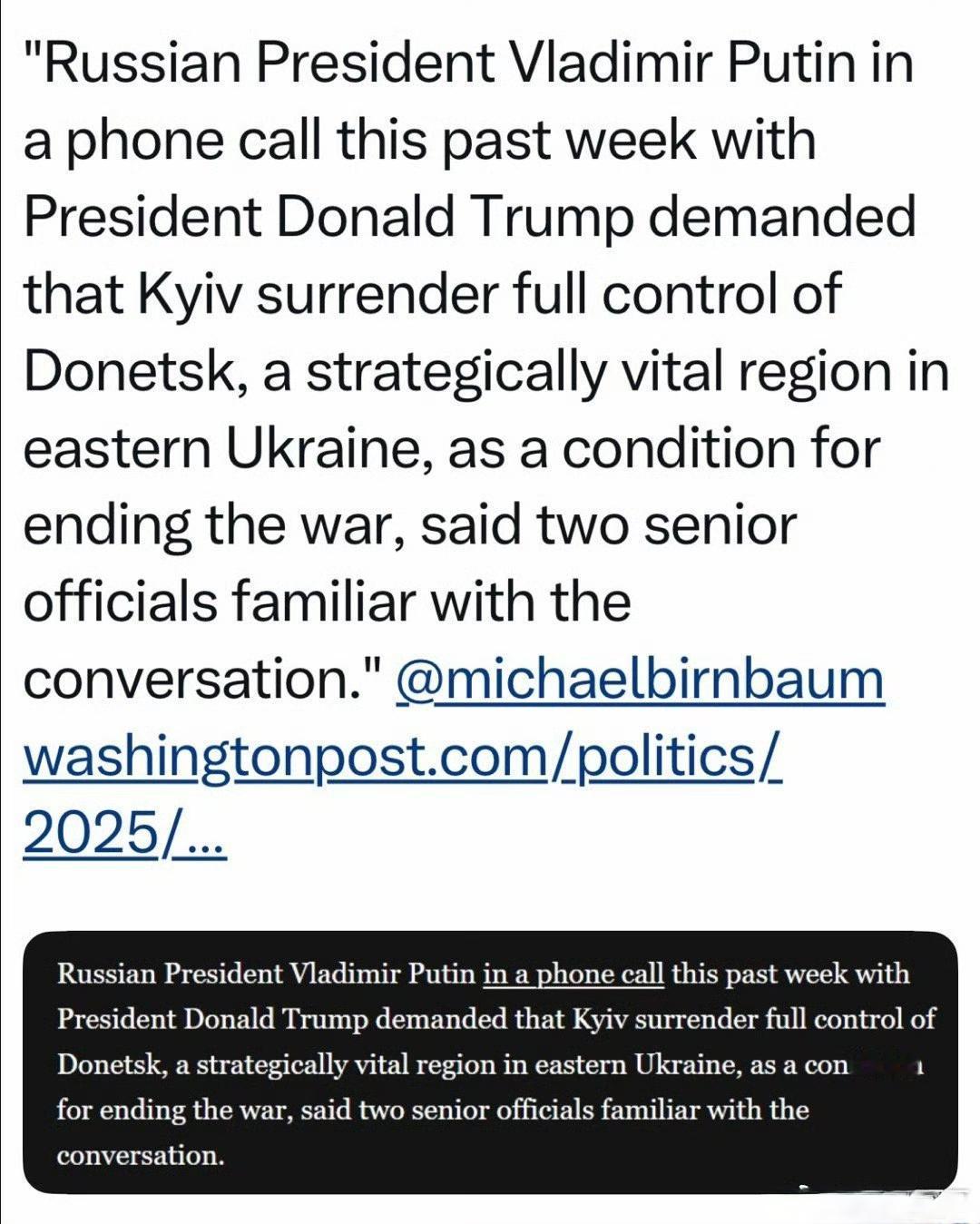 都说俄乌是美国一箭双雕的高明计谋,耗死俄,吸光欧,说得我都信了。那谁能解释清楚,为什么现在特朗普这么火急火燎地要让俄乌停火? 普京在电话里说只要把乌东(包括俄现在还没打下来的)都给俄,俄就停火。 于是特朗普的“和平特使“就跟泽连斯基说乌东都是说俄语的俄族人,就该给俄。 泽连斯基说你这逻辑不通,特朗普就指责是泽连斯基不想停火。