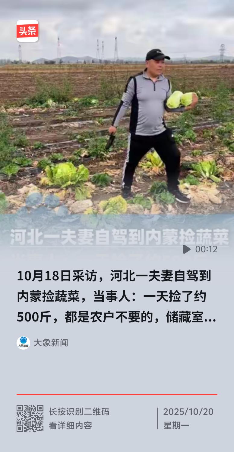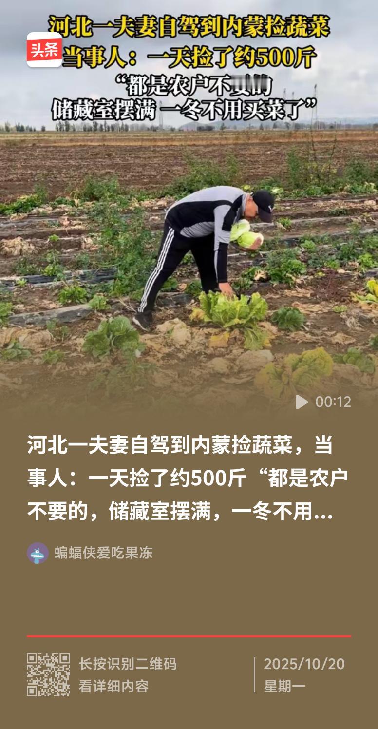 2025年10月16日,河北燕郊一对夫妻自驾去内蒙古多伦县。本来是冲着风景去的,到了机械化收割后的农田,发现地里遗留好多蔬菜,土豆、白菜、洋葱、甘蓝啥都有。 他们提前问了农户,农户说这些品相差、个头小或有损伤的“边角料”不要了,让他们随便捡,别踩坏未收庄稼就行。于是两人开始“扫荡”,一个找菜一个装袋,忙活一天捡了约500斤,装满汽车后备箱。这些菜够吃一冬天,吃不完的还能分给亲朋好友,既省了开支又体验到劳动乐趣,这趟“拾菜之旅”真是太值啦! 通州燕郊 多伦风景