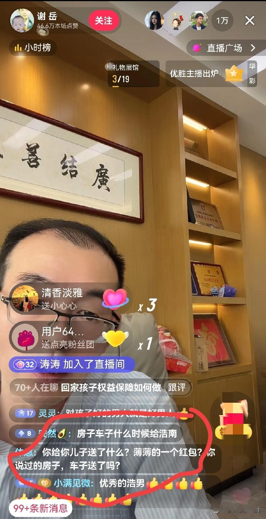 谢岳开直播回应叶锐聪回家一些粉丝关心的问题。 直播间里透露的信息量比较大,面对质疑被定义为黑粉,是否合适? 时隔多日,谢岳终于还是没忍住要开直播了,没想到儿子都找到半年了,热度依然不减,直播间里的人数稳定在1w+,不过这次谢岳没有关闭打赏功能,不知道是不是最近也响应平台规则了。 有几句话,他说的还是比较认可的,男人就应该扛起家庭责任,要给孩子撑起一片天,面对谢浩男他们的各种质疑,他都揽到自己身上,除了二婚这件事。 另外他也强调自己给那些寻亲家庭做了多少事情,不过听半天,也没听明白到底都做了哪些,最后总结就是比网友做的多。 然后就有人问谢浩男的名字什么时候改,房子什么时候过户,豪车什么时候买,并且还是好几个人一起问,并且说人家叶锐聪,认亲现场就亮出了新身份证,到现在都见过谢浩男的。 不知道是不是谢岳他们家不在乎认祖归宗这件事情,叶锐聪回家第一件事就是去祠堂拜谒,而谢浩男现在回没回过老家都两说呢。 另外大妹妹竟然现在还没有见过真正的雪,很想看一场雪,如果没记错的话,谢岳他们老家四川应该冬天也下雪吧?难道这么多年过年都不回老家吗? 老家是真没人了吗?就算没活人了,还有地下躺着的双亲呢,过年不应该去看看吗。 他们有钱人的世界,是我们无法理解的!