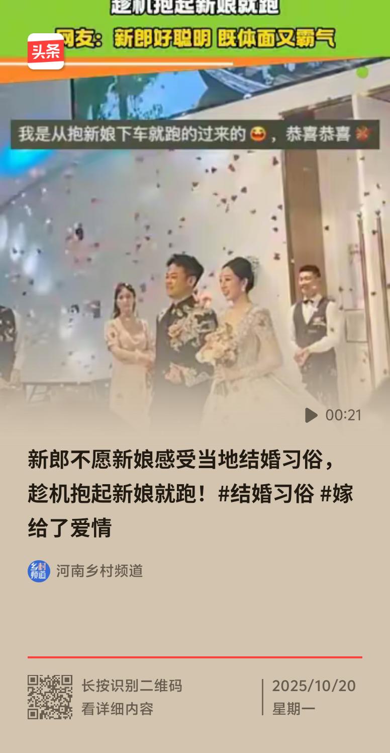 湖北一场婚礼上,新郎的举动太圈粉了。婚车到现场,亲友等着按习俗闹新娘,没想到新郎一下车,快步走向婚车,拉开车门一把抱起新娘。旁边有人想拦,他步子稳、方向准,一路抱着新娘径直走进酒店大厅。 网友纷纷赞“嫁对人了”。婚闹本是为了喜庆,可有时却成了新人的尴尬时刻。婚礼一生就一次,谁也不想被当笑料。这个新郎果断行动,既照顾了新娘感受,又给足两家体面。这不是冲动,而是真心疼人。希望更多新人面对习俗时,都能像他一样找到平衡,让婚礼满是美好回忆。 婚礼暖心一幕 婚礼上新郎