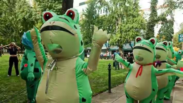 当地时间10月18日,美国多地爆发“不要国王”集会反对特朗普,约700万人参与。抗议队伍里,充气青蛙服成了标志性符号。这得从特朗普的移民执法行动说起,他的“铁腕扫荡”引发多地不满,波特兰作为“庇护城市”反应强烈。 “卖仔青蛙服”源自中国动画《葫芦娃》的“蛤蟆精”,如今美国抗议者穿它在街头尬舞,反对移民与海关执法局抓捕行动。他们还穿恐龙、浣熊等充气服装,以荒诞行为抗议驱逐移民和派遣国民警卫队。这种方式既展示欢乐氛围,反驳“战区”说法,还能减缓催泪瓦斯影响,让执法人员的追击显得可笑。不得不说,波特兰人抗议真是花样百出! 特朗普政策变脸 欧盟反击特朗普 美国游街抗议