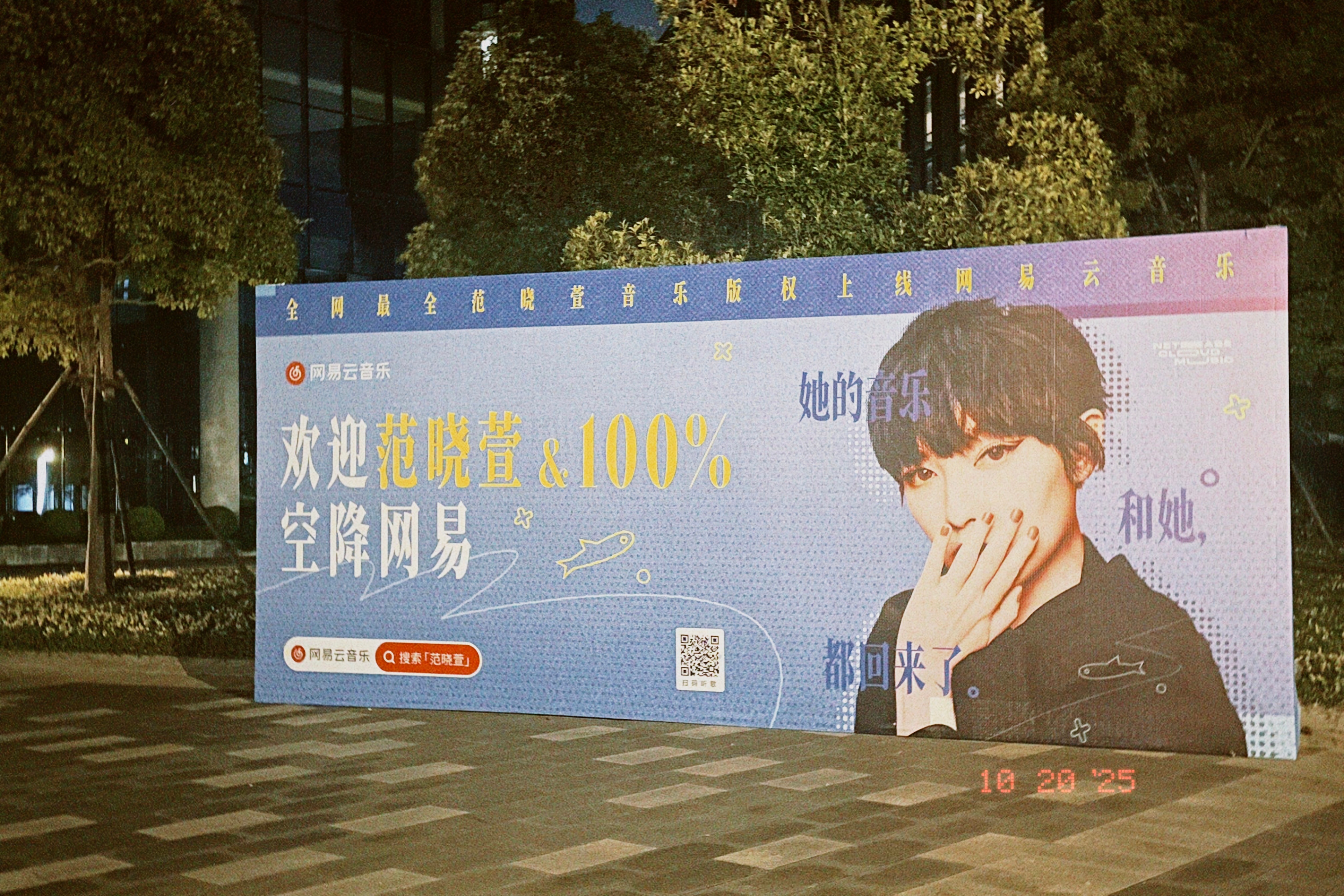 网易云对范晓萱这次版权落地算重视,还做了实体广告牌