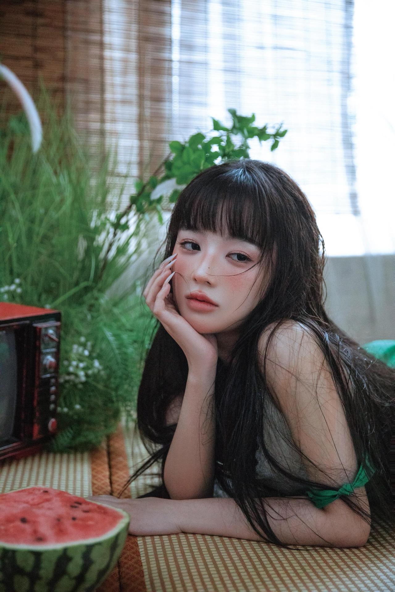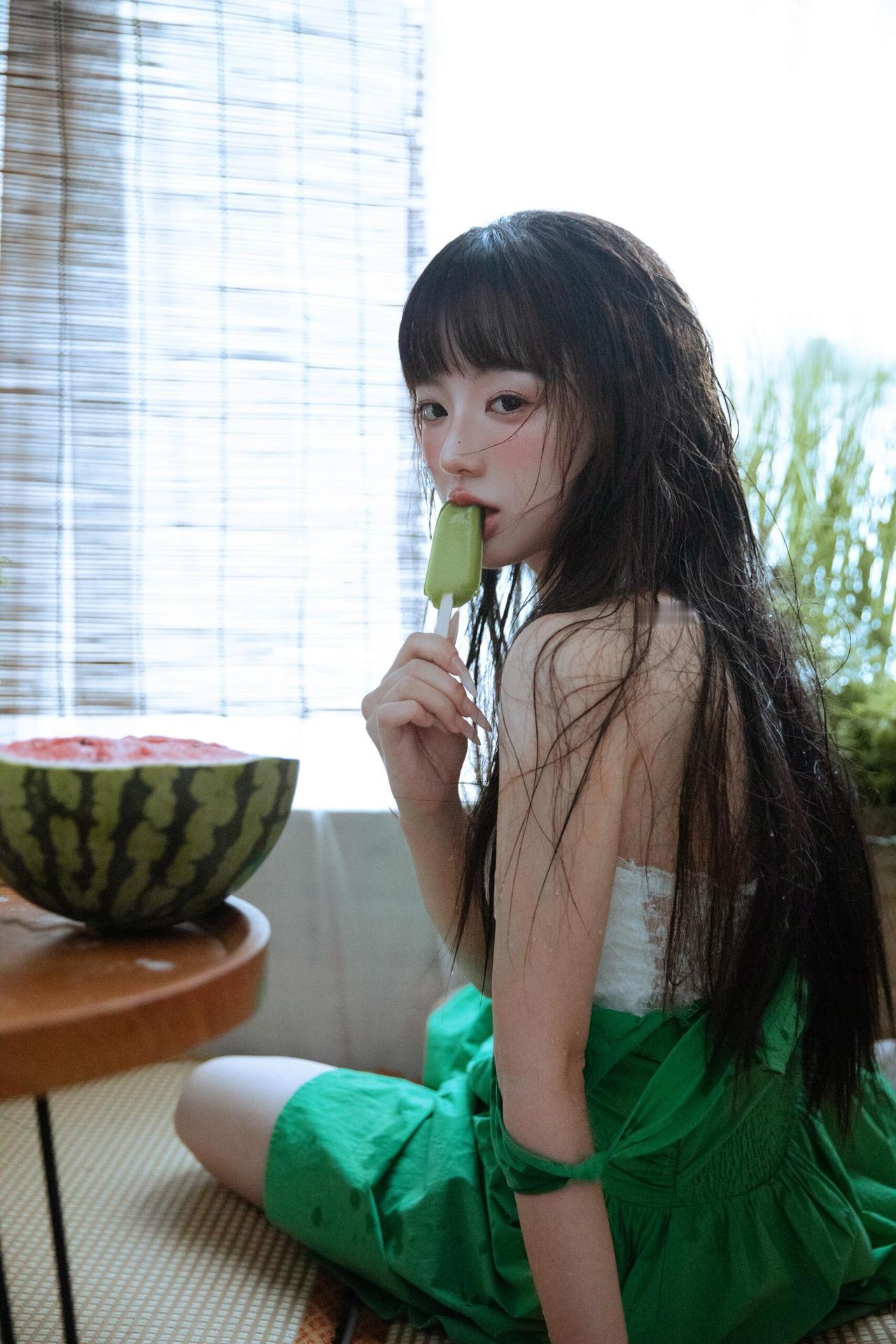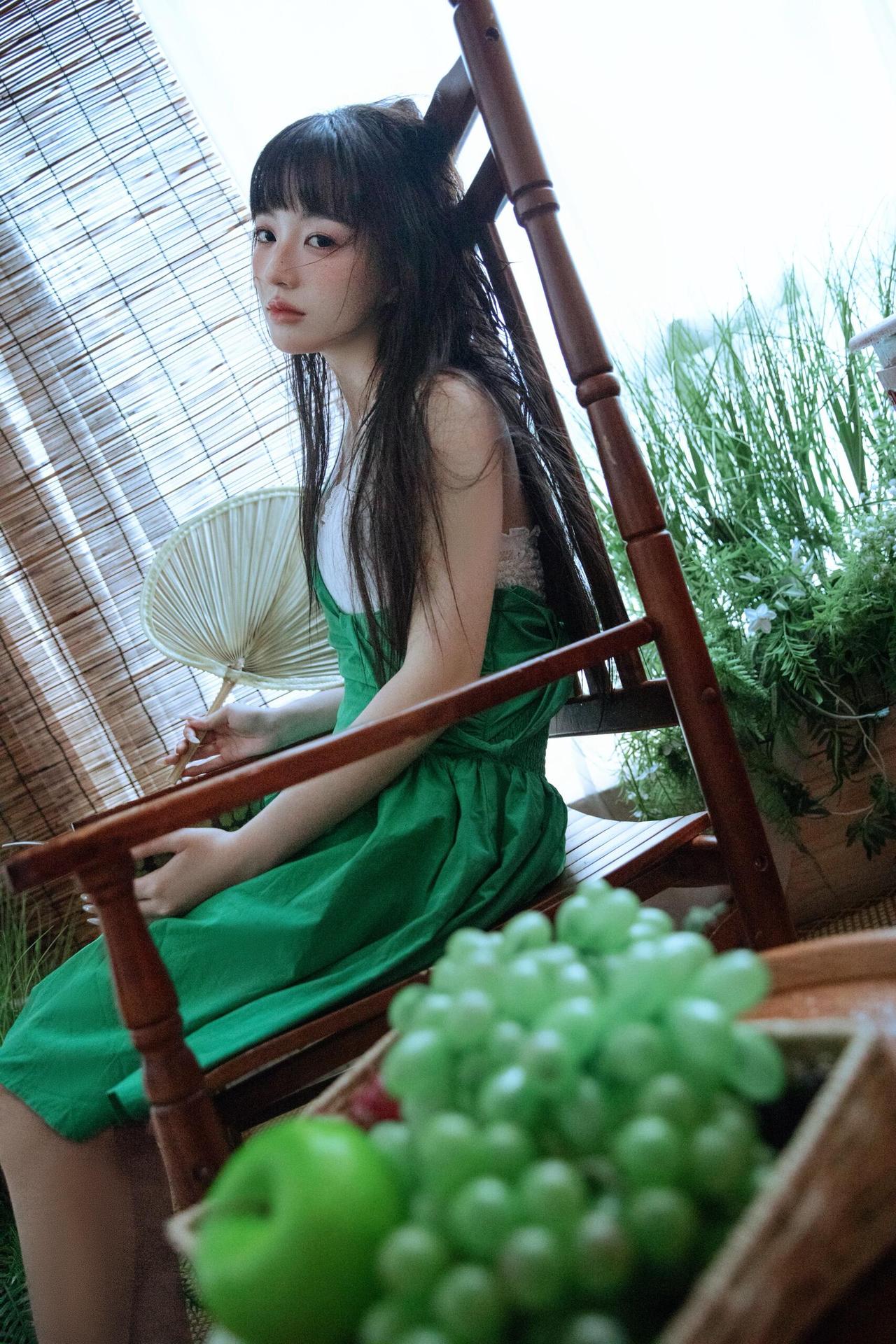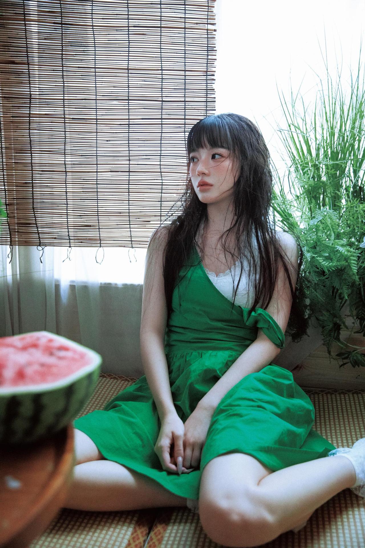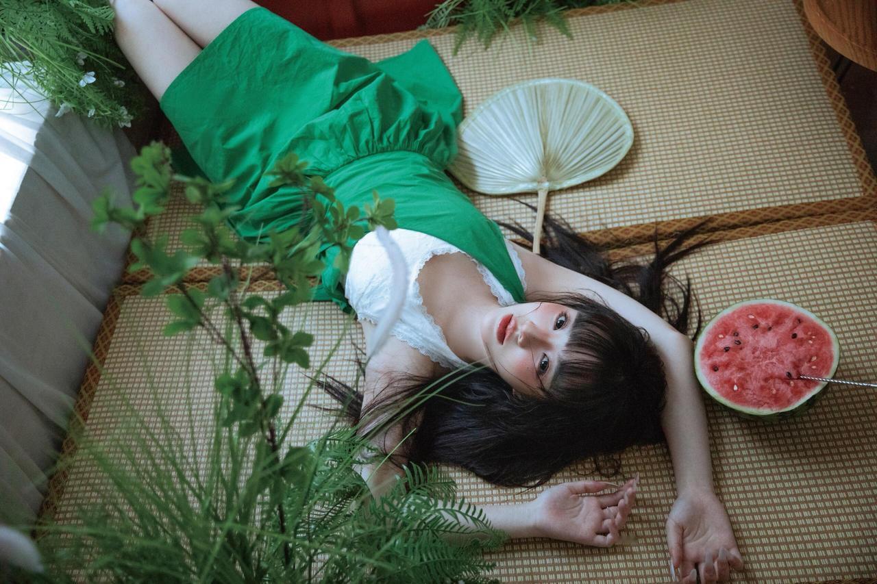 这组人像摄影画面中,绿色元素从服饰蔓延至环境,形成了一套完整的视觉语言系统。 模特身着的绿色连衣裙,以高饱和度的色彩瞬间抓住视线,而白色内搭的加入则中和了绿色的浓烈,增添了几分柔和质感。环境中的绿植、竹帘与西瓜的红绿对比,进一步丰富了绿色的层次——深绿的蕨类植物营造出幽深的自然感,浅绿的竹帘则带来日式家居的清新感,西瓜的红瓤更是为绿色主调注入了夏日的活泼气息。 构图上,摄影师擅长利用“线条”与“层次”营造空间感:竹帘的竖直线条引导视线,绿植的自然曲线柔化画面,模特的姿态或舒展或蜷缩,在画面中形成疏密有致的节奏。光线则采用了柔和的漫射光,透过白纱窗帘洒入,让绿色的饱和度显得更为温润,同时为画面蒙上了一层夏日午后的慵懒滤镜。 更值得玩味的是作品的情绪表达,模特的神态或慵懒、或沉思,与绿色所传递的“宁静、生机”特质完美契合,将夏日的闲适与青春的懵懂融合在绿意氤氲的画面中,让观者仿佛能感受到画面里的清风与蝉鸣。
