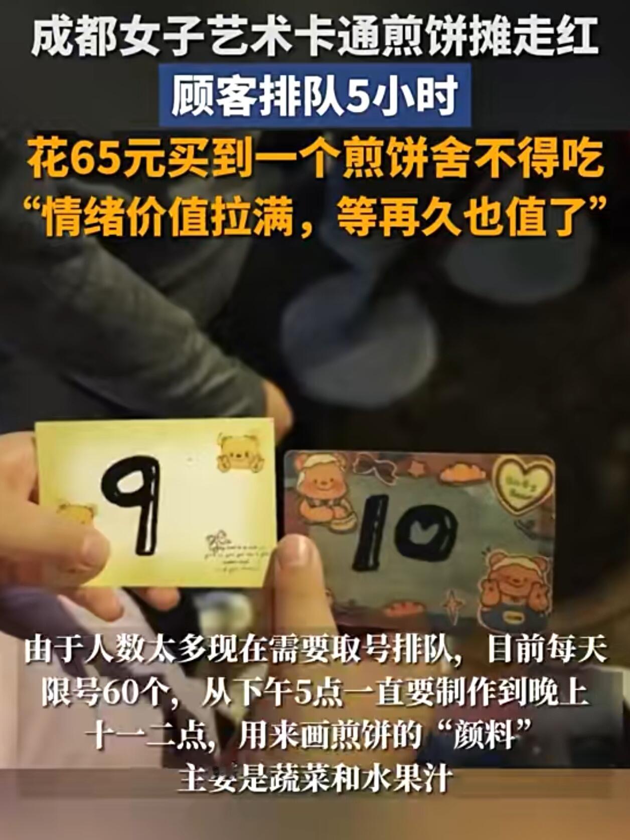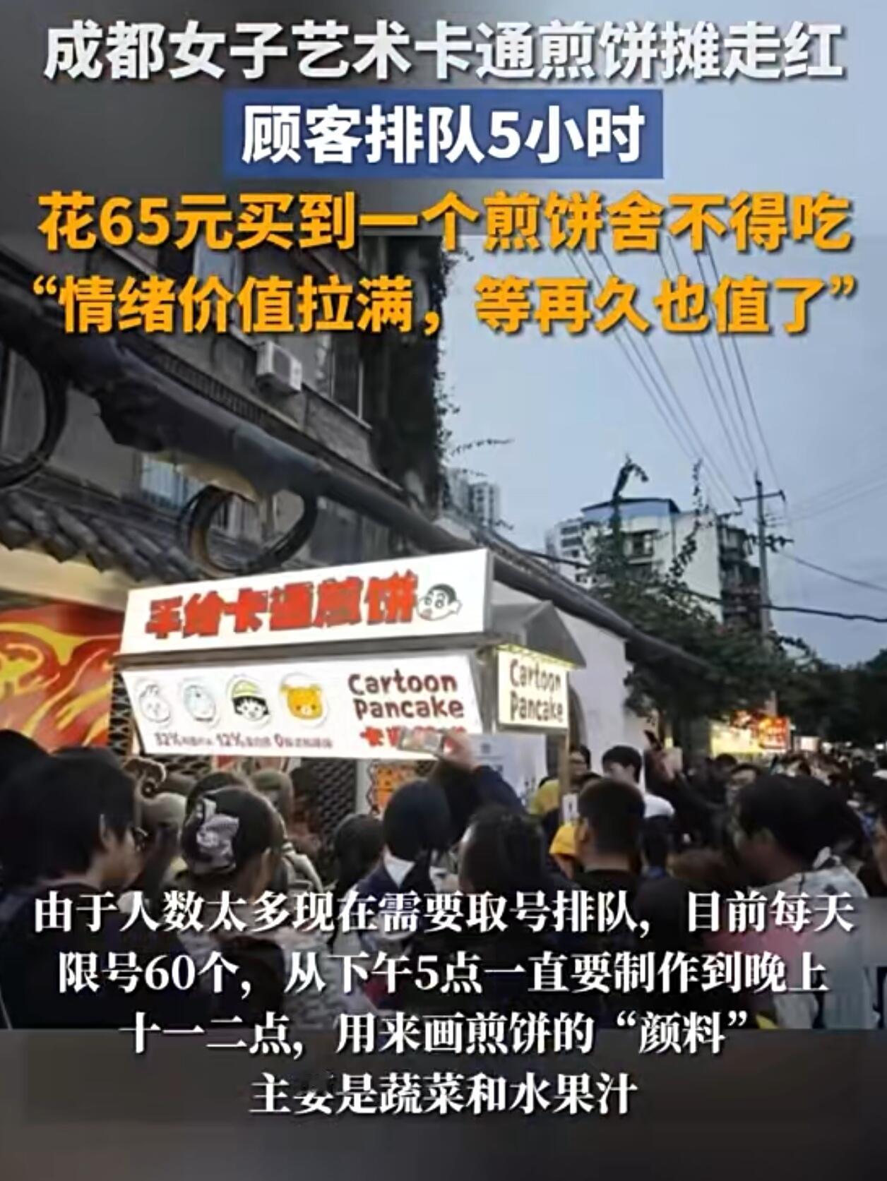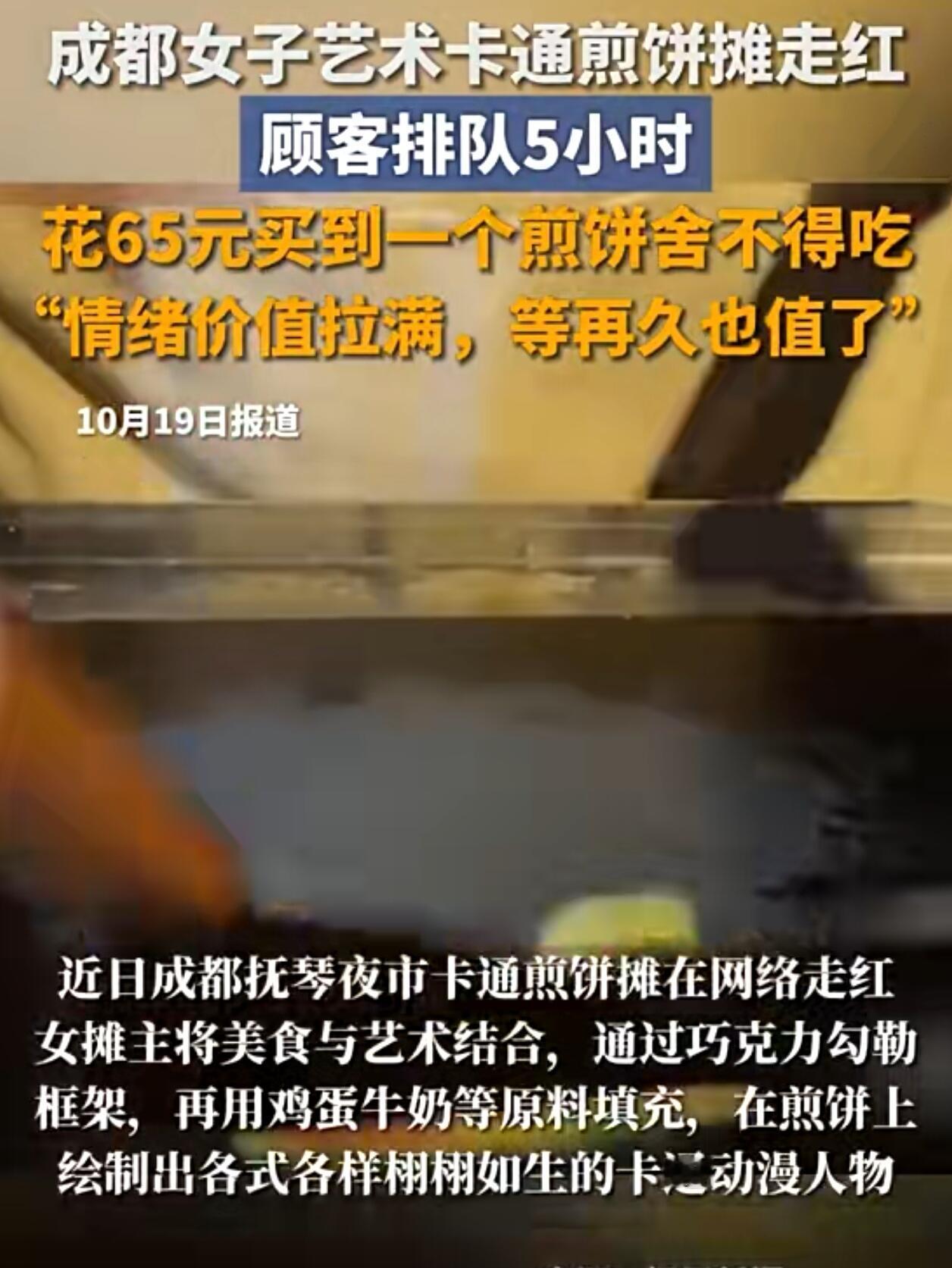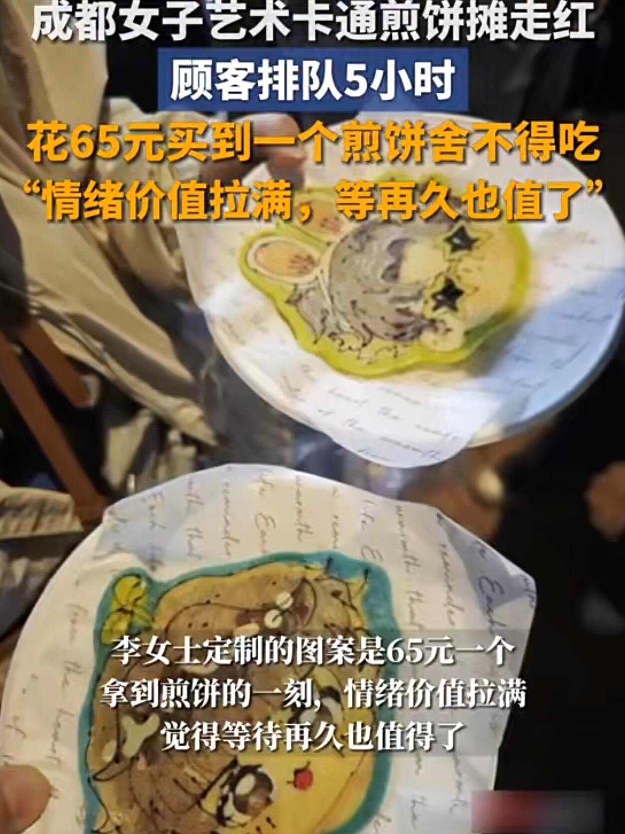 成都夜市最近有个煎饼摊彻底火了!为啥?人家卖的可不是普通煎饼,而是能把动漫人物直接画在煎饼上的“艺术品”! 摊主是个95后美术生,这姑娘可太会玩了。她做煎饼就跟画画似的,每次快要成型的时候,围观的人全都举起手机,胳膊再酸都不敢放下,就等着拍下翻面那一刻——面糊神奇地变成清晰的动漫图案,那场面绝了! 价格也分三六九等。简单点的15到25块,复杂精细的动漫人物得65块。最费工夫的定制款,做一个就得半小时,这哪是在做煎饼,简直是在搞创作。 就这一个小摊,从下午5点开门就一直忙到半夜。最夸张的是有人甘愿排队5小时,就为等一个煎饼。而且拿到手都舍不得吃,举着各种拍照——确实,这么精致的图案,谁忍心下嘴啊? 要我说,这早就超出煎饼的范畴了,这根本就是能吃的艺术品。现在人消费观念真变了,愿意为这种创意和情怀买单。等5小时确实夸张,但想想能拿到独一无二、带着童年回忆的动漫煎饼,好像也挺值的? 你们要是遇上了会去排队吗?反正我可能顶多等半小时,毕竟肚子饿起来可等不了那么久。快来聊聊,你们为了美食最多等过多久?