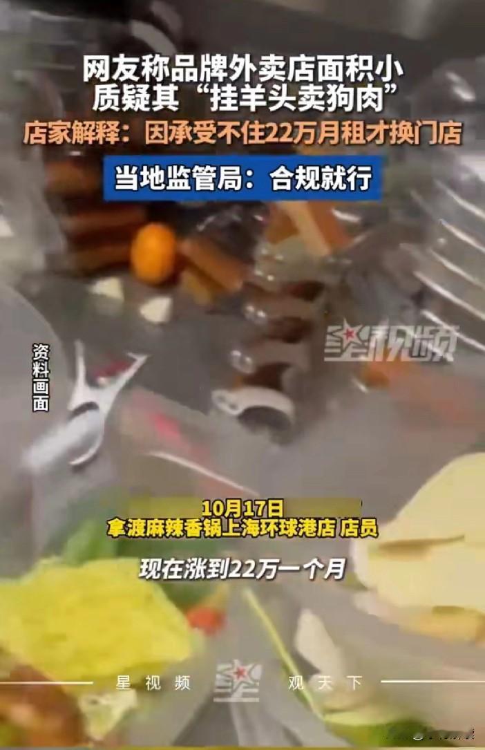 知名麻辣香锅品牌变路边小店? 根据星视频报道,有网友发现知名连锁拿渡香锅变成了路边的小店,质疑其真实性和合理性,以为是假的,结果咨询下来确实是真的[捂脸] 当地的监管局也回应,只要是合规合法证照合一就行,店员说只是因为房租太贵无法承受,从环球港里面搬了出来,从十几万涨到22万一个月的房租。 所以明白为什么老是有人说上海物价太贵了吧,那是因为根源在于房租太贵,22万一个月,还要加上人工水电五险一金原材料等等开销,这个店一个月的流水最少要做到3倍才能挣钱吧?