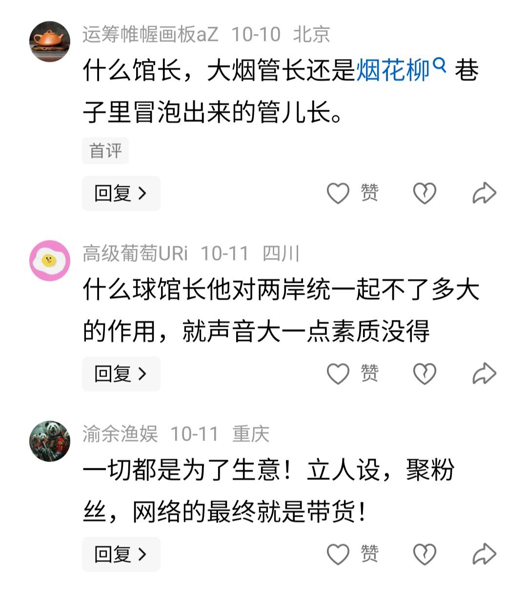 大陆网友对台湾网红馆长的批评主要涉及投机行为、语言粗俗及曾有不当言行等方面。具体包括质疑其到大陆直播的动机、不满其粗俗语言风格,以及批评其过往攻击性言论。 投机行为:部分网友认为馆长存在首鼠两端的投机行为。例如,有报道提到质疑其到大陆直播是拿了钱,批评这种行为是为了获取利益而采取的投机做法。语言粗俗,缺乏修养:馆长的语言风格较为粗俗,这引起了很多大陆网友的不满。在交流互动中,其言语表现不符合一些人对于文明、得体交流的期望。各位有啥看法?@真业心学创始人东方赢 欢迎评论。