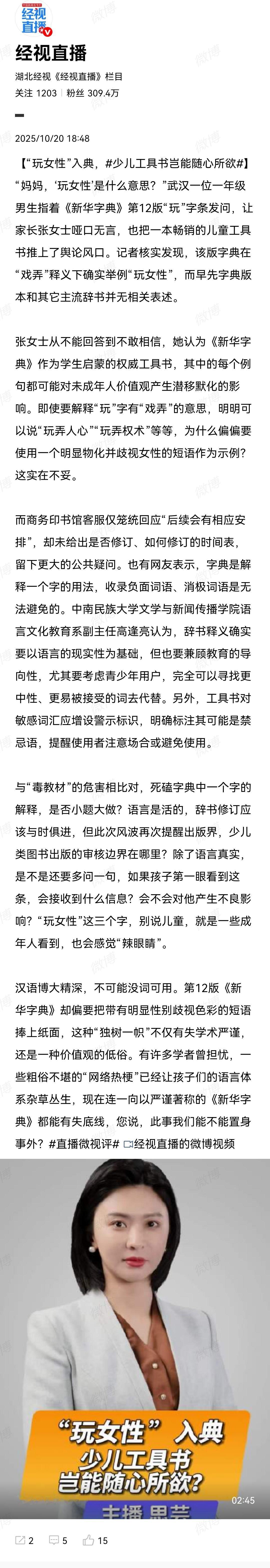 “玩女性”入典?作孩子的启蒙权威教材,新华字典里面的“玩”字组词竟然是“玩女性”! 这是不严谨的操作还是有意而为?“毒教材”余波还没有彻底解决,这新华字典又出现让人匪夷所思的操作,两年前新华字典里的“倭寇”被移出新版新华字典引起的争议也是让人云里雾里,今年7月份还有网友家长发现新华字典里的组词造句的“累”字造句指导竟然是:“孩子小,成了累赘”! 真的让人想不通,一本作为孩子们的权威指导的辅助教材,怎么会出现这种指导! 中国文字博大精深,就找不到词句来填充一本新华字典了? “玩女性”和“孩子小,成了累赘”这些带歧视性和误导性的谴词造句在孩子的辅助教材上出现真的就没有人审核一下吗? 资料来源:上观新闻、观察者网、湖北经视《经视直播》