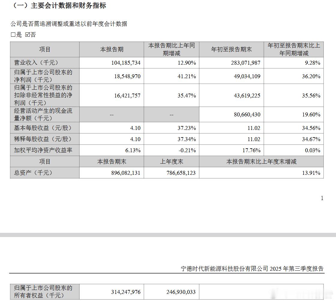 10月20日,宁德时代发布2025年第三季度业绩报告。财报显示,2025年第三季度,营收1042亿元增长12.90%,净利润185亿元增长41.21%,日均净利约2.05亿元。