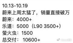 10月21日,知名博主发布,蔚来公司上周交付破10.6K,其中蔚来超4K、乐道超5K、萤火虫超1.5K。