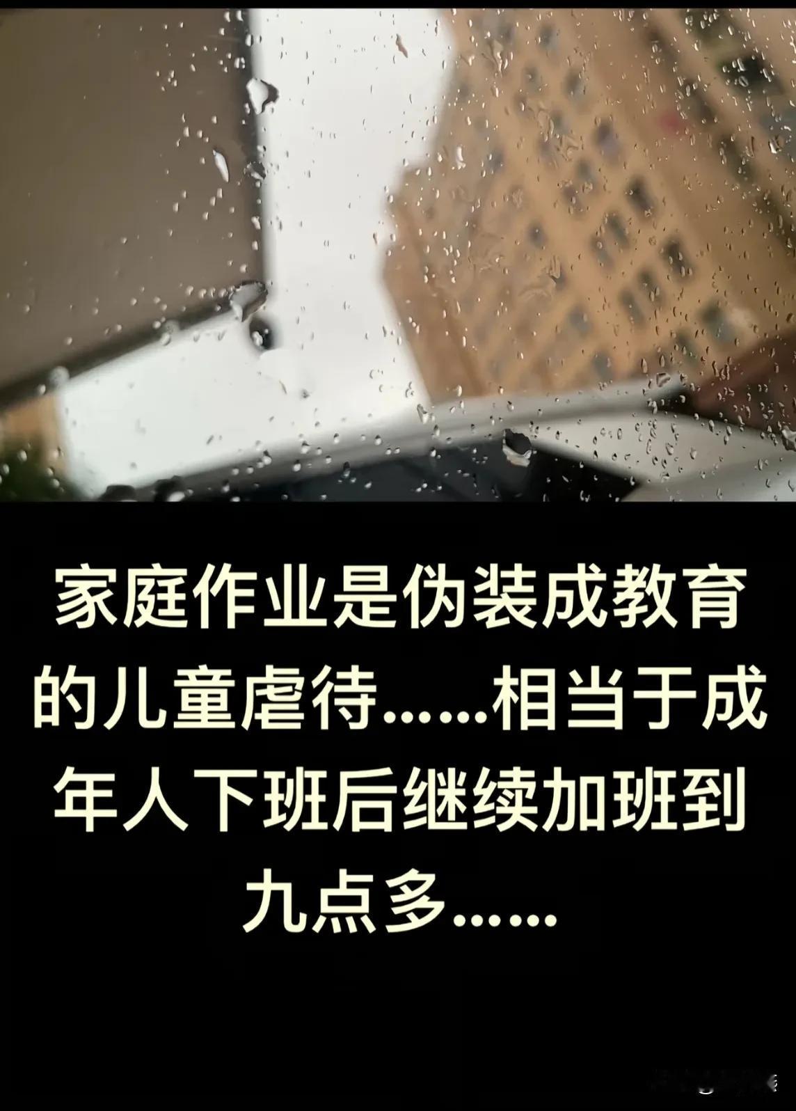 关于这句话,孩子多半都会刷到,还是早点放手吧 1,孩童时代的家庭作业,是伪装成教育的儿童虐待,相当于成年人下班后,老板在群里派活,继续加班到九点多 2,睡觉比家庭作业重要,运动比家庭作业更重要 3,写不写家庭作业,家庭作业写到几点,跟他能不能上985,能不能考出去,没有任何关系 少儿家庭教育 父母虐待孩子 家长负担过重