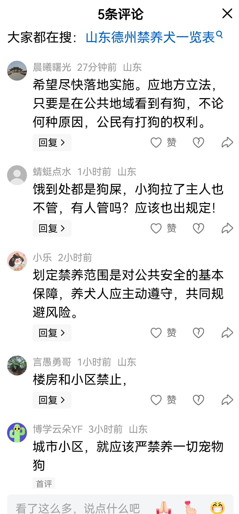 好消息!好消息! 关于禁养犬问题,德州市农业农村局近日发布公告,向社会广泛征求意见。 养狗如今真成了严重的社会问题。以前养狗多在农村牧区,现在城市里养狗的人越来越多,目的也是五花八门,有出于喜好的,有排解孤独的,甚至还有炫富的。 由于缺乏健全统一的法规,狗患问题已经成为严重的社会问题。现在城市人口密度大,养狗量却日益增多,问题就更突出了。不少小区里,狗狗随地大小便,影响卫生;有些狗主人放任狗狗自由活动,咬伤路人,尤其对小孩和老人威胁很大,邻里间也常因养狗产生矛盾。养狗问题真得好好整治,让人和狗狗能和谐共处。
