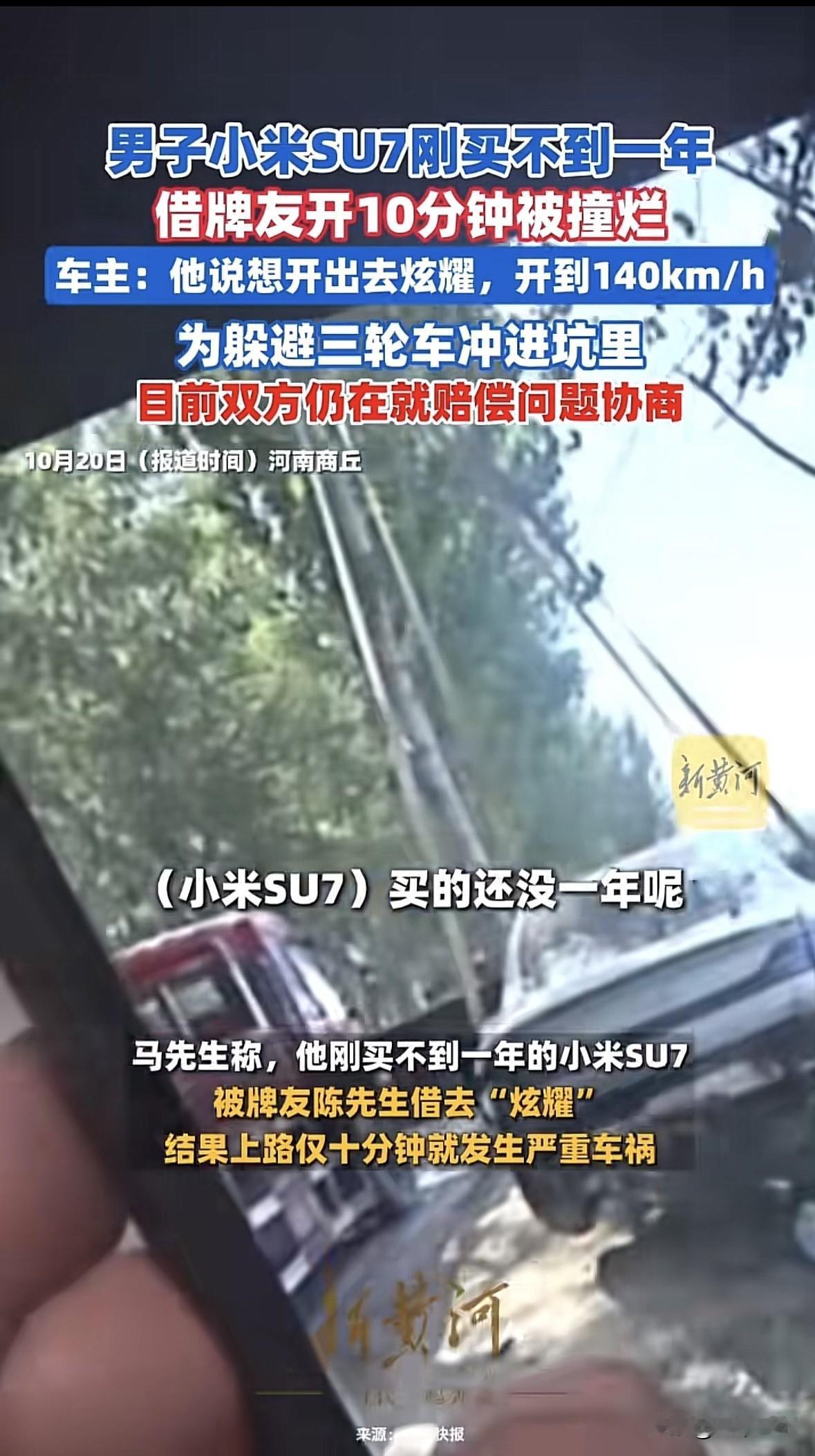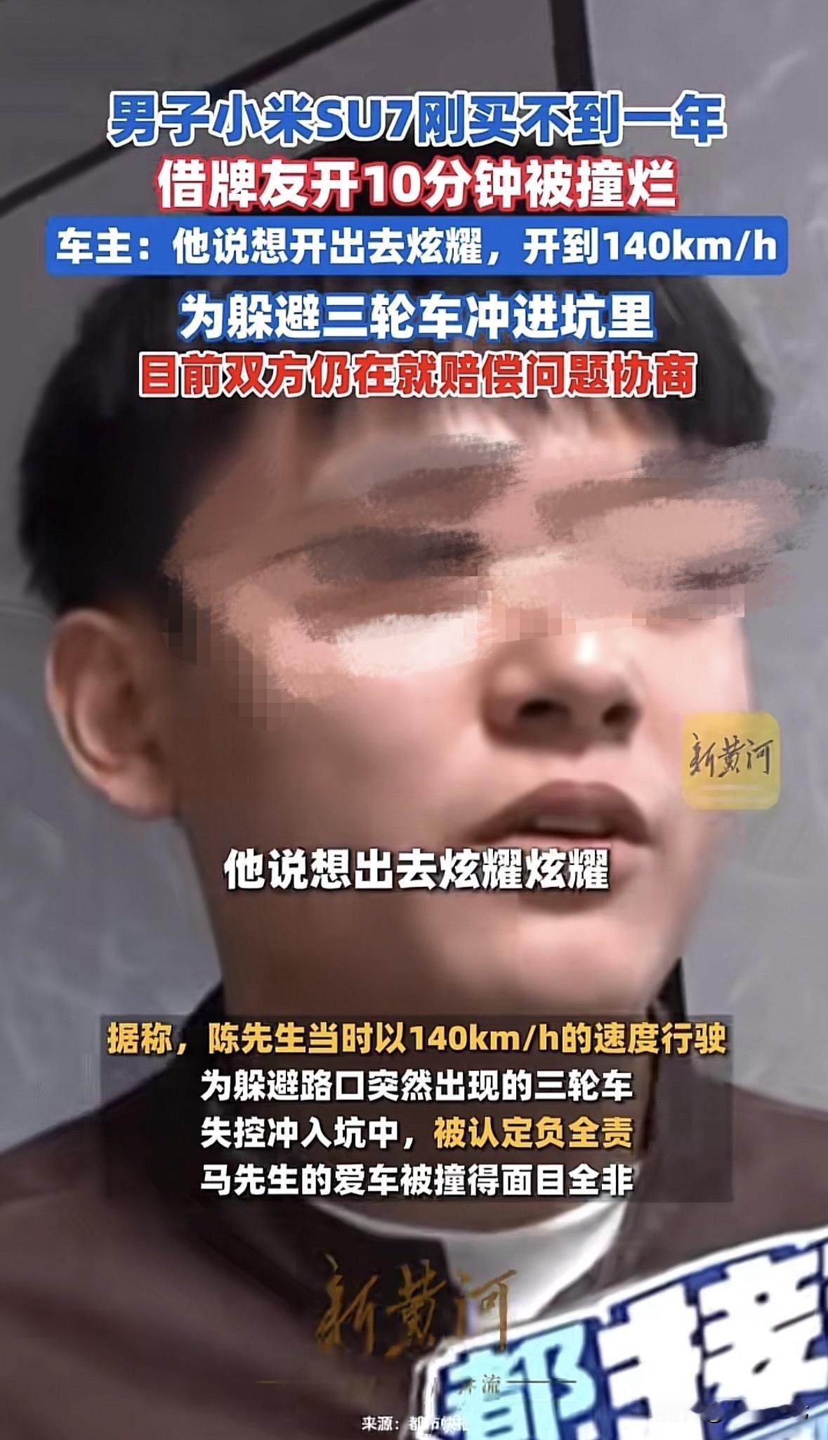 河南商丘,男子把刚提不到一年的小米SU7借给牌友开,结果被对方开出去一顿炫耀,牌友路上想嘚瑟一下,就一脚油门踩到140码,谁知这时路口突然出现一辆三轮车,牌友为了躲避,直接失控冲进坑里,才借走不到10分钟的功夫,男子的爱车就被撞的面目全非,他让牌友赔偿27万,外加2万违约金,可牌友接下来的一系列操作让男子闹心不已。 马先生的小米SU7买回来还不到1年,那天他开出去打牌,牌友陈先生盯着他那辆新车来回打量,眼睛都挪不开了。 接着,陈先生开口说,老马,让我开出去兜一圈呗?就给我们那帮哥们儿开开眼! 要说马先生心里没犹豫是假的,这车他也没买多久,还是新车,自己还没过热乎劲呢,不舍得借别人开。 但看着陈先生期待的眼神,他到底还是把钥匙递了过去,并嘱咐道:慢点开啊,早点回来。 陈先生乐呵呵回道:你放心!半小时后准时送回来! 然而,车开走还没10分钟,马先生的手机就响了,电话那头陈先生结巴又心虚地说:老马…车…车撞了… 等马先生赶到现场看到眼前一幕,心都碎了,他那辆宝贝爱车被撞得车头稀烂,安全气囊也全炸开了花。 这到底发生了啥,能把车撞成这样? 原来啊,陈先生开上车后为了给朋友们炫耀,他一脚油门直接踩到底,飙到了140码。 开到岔路口时,一辆三轮车突然冲出,陈先生猛打方向避让,车子直接冲进路边施工坑里。 事后,陈先生被认定为全责。 马先生气得不行,脸色铁青着问陈先生咋办? 陈先生知道自己闯大祸了,他赔着个笑脸,说你的车交给我,我拖去维修,维修费用我全掏,你放心。 马先生看着自己的车撞的跟报废差不多了,再咋修,经过这事故车都已经贬值了,这让马先生心里有个大疙瘩。 他告诉陈先生,我不要你给我修,你给我赔偿27万,外给我2万违约金,要不你就给我赔一辆一模一样的新车。 陈先生说,新车也才29.9万,况且你的车已经开了3万公里了,我肯定没法给你29万的赔偿,也没法给你赔辆新车。 俩人因为赔偿的事迟迟谈不妥,闹得很不愉快,但陈先生还是把车先拉走处理了。 期间,马先生提议把陈先生的那辆GL8留给自己,要不他这段时间开啥? 陈先生听后倒是挺配合,把车送来了,让马先生先开着。 然而,马先生万万没想到,陈先生拉走他的车后,竟再也联系不上人了。 马先生心想,你不还我SU7也行,那你留我这的GL8也别想开走! 两人就这样僵持半个月后,警察突然找上了马先生的门。 原来,那辆GL8是陈先生从租车公司租的,现在租车公司收不到车直接报了警。 民警严肃地说,你这算非法扣留他人财产,租车公司要起诉了。 马先生委屈地讲述了自己和陈先生之间产生的纠纷,并表示他根本不知道这辆车是他租的。 直到事情闹到这个地步,陈先生才终于肯露了面,他当面许下承诺,说我赔你一辆1万公里以内的准新车,你看行不? 马先生想了想,同意了,他这次表示,我再等等,如果你最后拿不出准新车,那咱们就法庭见。 有人看后哭笑不得,说这陈先生至于吗?借车开出去炫耀,这下好了,玩大了! 车子一般不外借,因为即使是老手换个车开车感也是不一样的,得十分小心,更别说借来飙车了,这马先生估计也长记性了,以后不敢再给别人借车了。 也有人提议,说为啥电车不像电动自行车一样锁速度上限?锁到125超速违章也少了,事故也少了。 那么,从法律角度,怎么看待这件事? 《民法典》第1209条规定:因租赁、借用等情形机动车所有人、管理人与使用人不是同一人时,发生交通事故造成损害,属于该机动车一方责任的,由机动车使用人承担赔偿责任。 陈先生作为车辆实际使用人,超速导致事故且被交警认定全责,依法需要承担全部赔偿责任。 马先生虽为车主,但借车时无法预知陈先生会危险驾驶,且没有证据可以表明车辆本身存在故障,所以马先生无过错,不承担赔偿责任。 如果最终陈先生没有履行赔偿承诺,马先生可主张车辆实际价值,需扣除使用折旧或等同价值赔偿。 马先生扣留GL8系自力救济,但这个车为租赁财产,可能涉及《刑法》第270条侵占罪风险,及时协商归还更符合法律程序。 租车公司起诉陈先生是基于《民法典》第715条“承租人保管租赁物义务”,与马先生扣车无直接因果关系。马先生配合还车后,租车公司应向陈先生追责。 虽说生活中建议大家不要轻易把车借给别人,但是如果迫不得已需要借的时候,大家也一定要进行一个风险防控。 比如说,首先要确认借用人驾照有效,其次,明确禁止酒驾、超速等条款,可以书面约定,这样更具有法律效力,不至于真出事的时候掰扯不清。 还有,借出前检查车辆保险有效性,如第三者责任险。 马先生如果遇赔偿拖延,应直接起诉陈先生而非扣留第三方财产,避免责任转嫁。 对于这件事,你怎么看? 欢迎关注@一案一论
