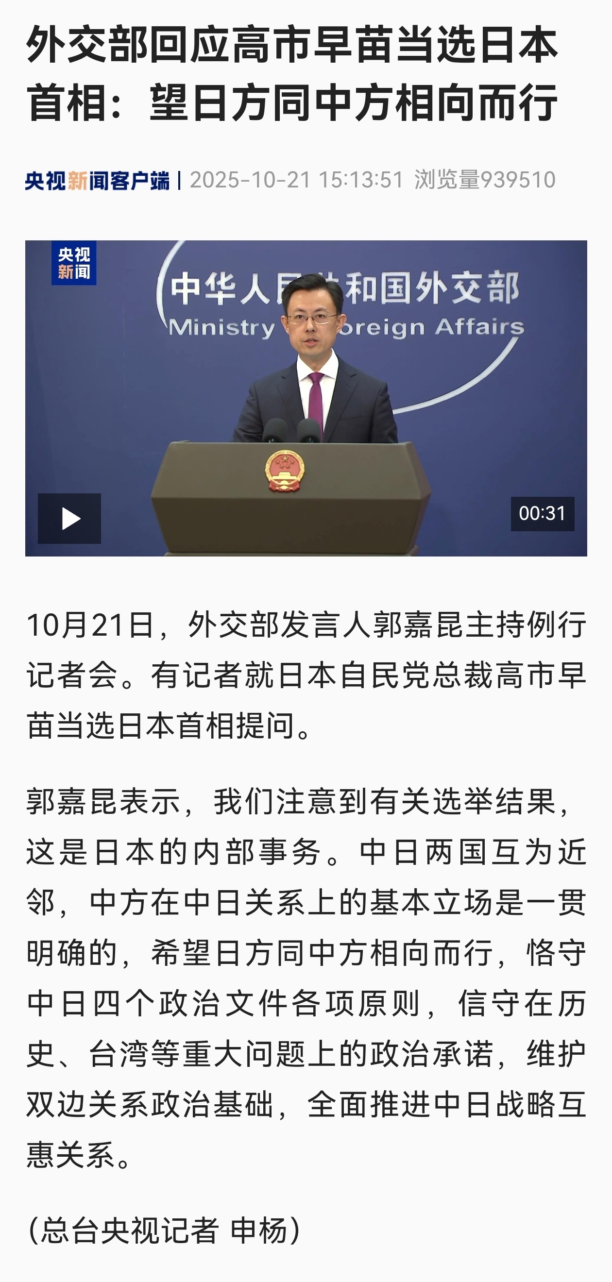 中方回应高市早苗当选日本首相省流:我们知道了。