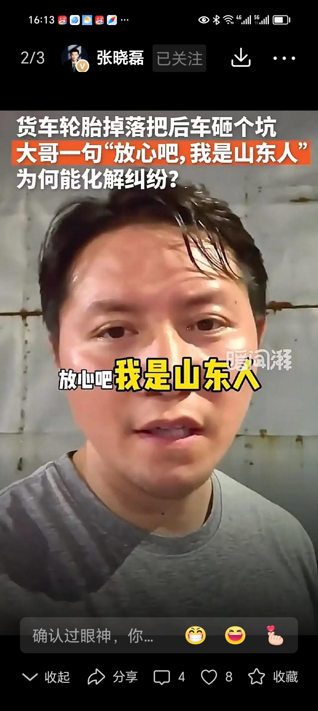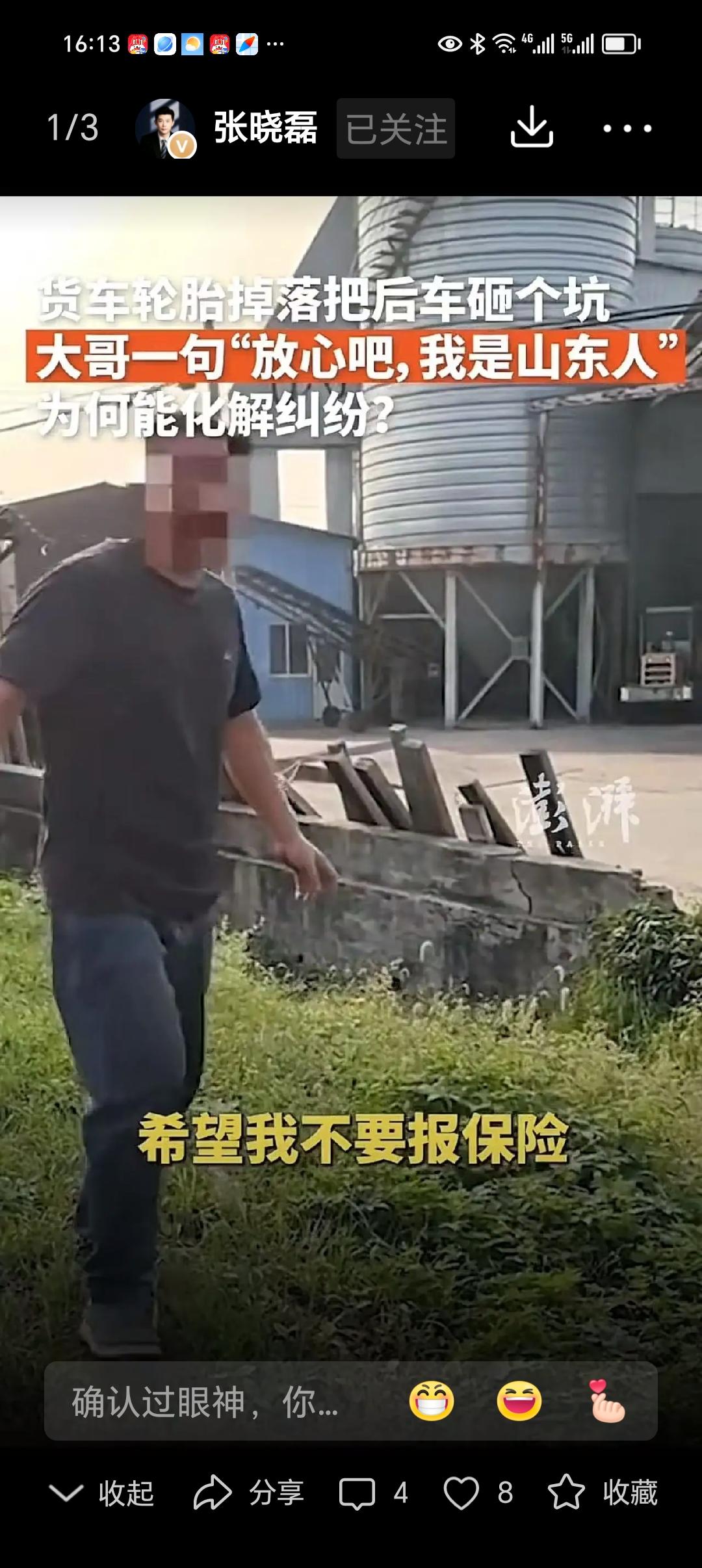高速上货车司机掉轮胎事情的真相远比表面更令人唏嘘,也更让人深思。那位山东货车司机在轮胎脱落砸到后车后,坦然承诺赔偿,甚至没有试图逃避责任。这一幕,似乎让人感受到一种朴实无华的善良与责任感。然而,事情的后续,却揭示了另一层令人震惊的真相。 几天后,受害车主发现对方并没有如承诺那般赔偿,反而消失得无影无踪。这一反转,让人不禁陷入沉思:善良是否也需要守护?信任是否也需要被尊重?这起事件成为了一个社会的缩影,折射出部分人善良的同时,也暴露了信任的脆弱。 然而,令人欣慰的是,网友们的反应极为温暖。“90%的山东人都很善良”,这句话成为网络的热议。有人说:“‘我是山东人’的含金量很高,因为它代表了诚信、责任和那份纯粹的善意。”这不仅是一句口号,更是一种文化的象征。山东自古以“厚道”著称,善良、实在、讲义气,深深根植于这片土地的血脉中。 这起事件让我们看到,善良的人们需要更多的保护和理解,也提醒我们在信任他人时要保持一定的警觉。善良不是盲目的,而是一种力量,激励我们去相信更多的可能,也让社会变得更加温暖和有希望。 或许,我们每个人都可以从这件事中汲取一份力量:在坚守善良的同时,也要学会用智慧守护自己。正如那句“我是真诚的山东人”,它不仅仅是一句简单的话,更是一份责任和承诺。让我们共同相信,善良的力量终将战胜冷漠,用真诚和责任,铺就一条更加美好的未来。货车撞人事件