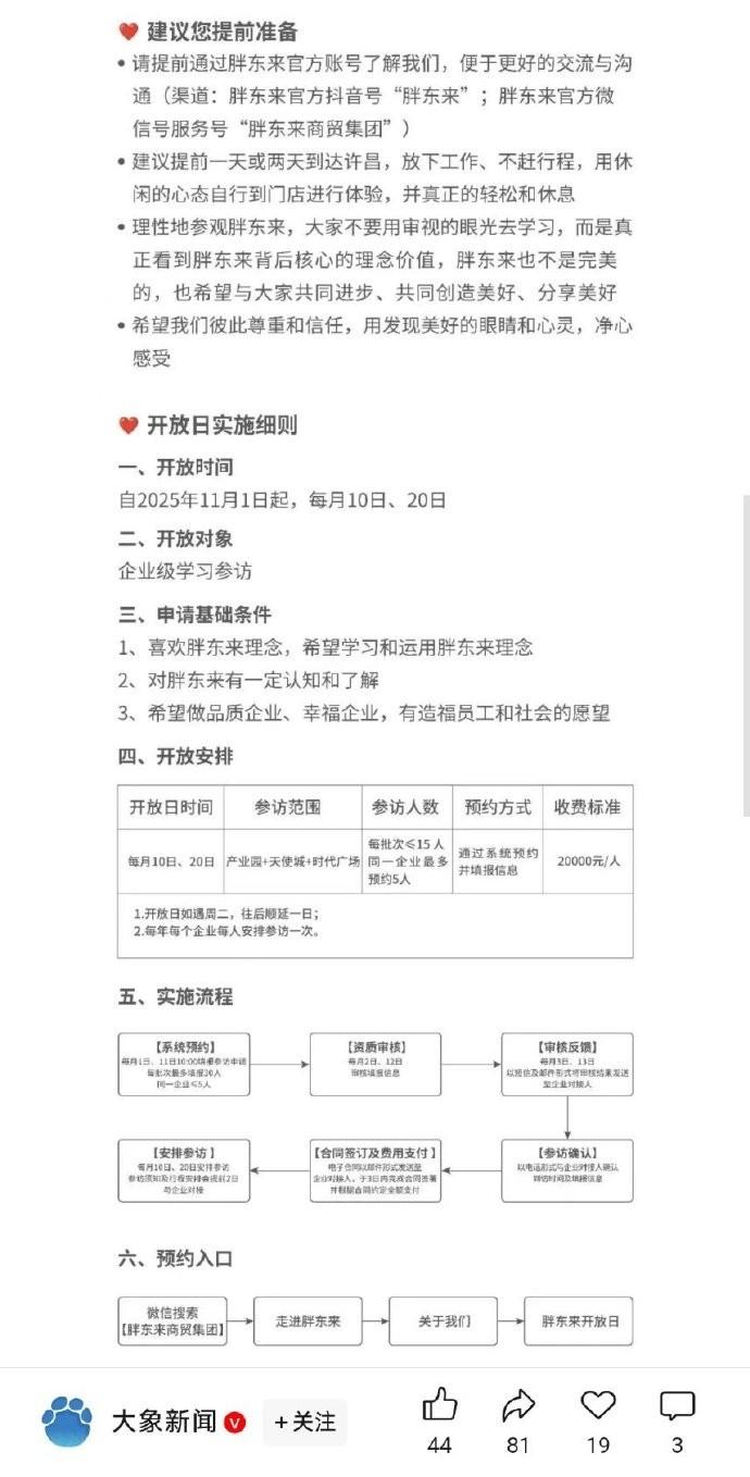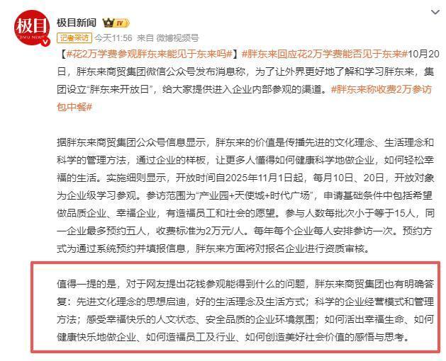 胖东来可能又要上热搜了。 想去企业内部参观每个人要花20000元,还不一定能见到于东来本人。 10月20日,胖东来商贸集团微信公众号发布消息称,从2025年11月1日起,每个月的10日和20日,开放给其他企业参观。 这个是有限制的,每个批次小于15人,同一个企业最多5个人,每个人2万块钱,有一天的参访时间,中午还包一餐饭,一个人一年只能参加一次。 这个还得去预约,胖东来审核过了才算预约成功。 而且工作人员也说了,还不知道于东来自己会不会出面。 说实话,2万一个人,对于普通人来说可能有点多,但是如果面向的是企业反而能理解,毕竟再怎么说,也得设个门槛,不能谁都接待,到时候给自己找麻烦。 再说了,这是去学管理的,2万块钱也算是一个筛选了,那些不赞同胖东来的同行刚好也不用浪费这个钱了。 至于于东来自己会不会出面,我倒是觉得这个不好说,得看来的是谁,现在于东来也不能把这个话说死了,不然到时候不好变通了。 我感觉这个事不仅会上热搜,也可能会有不少企业去参观吧,毕竟员工待遇好,盈利高不是哪个企业都能做到的,真学会了说不定整个行业都会迎来蓬勃的发展。 你怎么看待这件事?