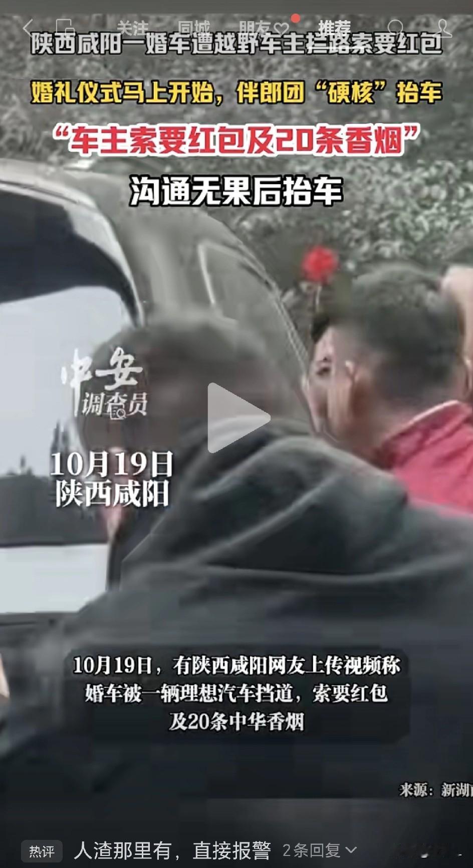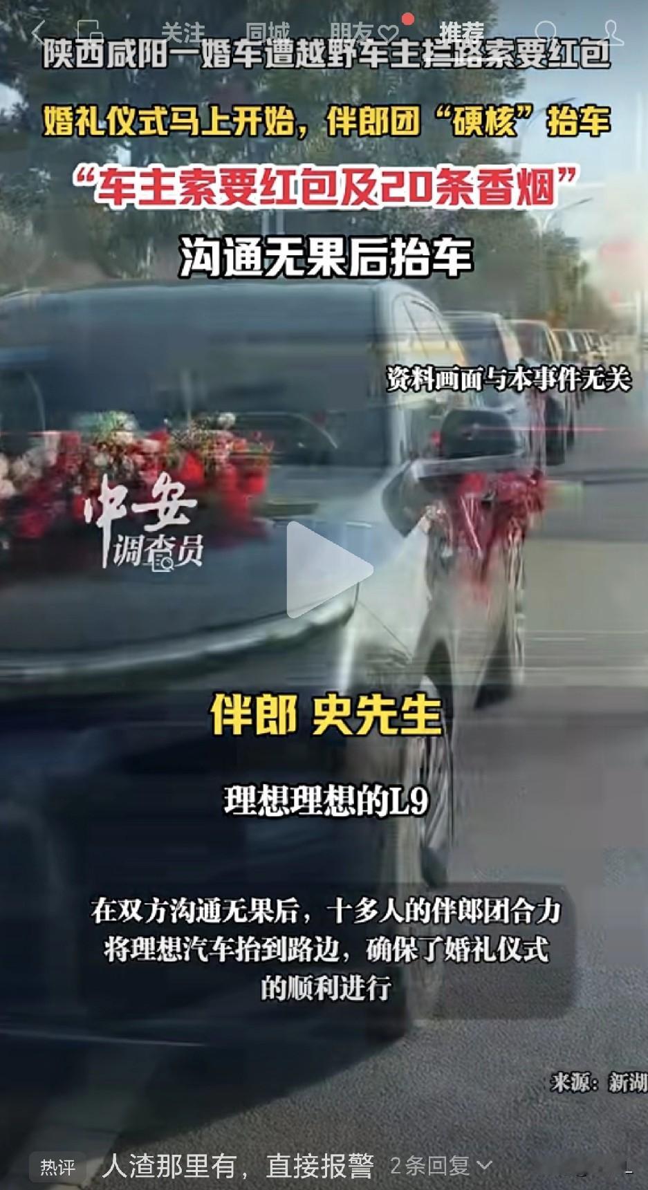 “讨喜”还是抢劫?理想车主拦婚车,开口就要20条中华!硬核伴郎团上线:抬它! 10月19日,陕西咸阳,有网友上传视频,婚礼车队在行进过程中,突然被一辆理想L9越野车拦住道路。 据悉这位理想车主,是新郎父亲的熟人,而拦路的目的,号称是“讨喜”,但他讨要的数额让人咋舌。 他要红包+20条中华烟! 天呢,这哪是“讨喜”,分明就是拦路抢劫啊! 众人与他沟通20多分钟,都没能让他退步,还造成后方交通拥堵。而婚礼时间接近,新娘在车里焦急万分。 关键时刻,还得是好兄弟,硬核伴郎团上线了。 为避免错过婚礼吉时,十几个人合力将越野车抬至路边,全程约1分钟。伴郎强调抬车时注意底盘,确保了安全移车,车辆无损。 视频一出,直接引爆了评论区: “这不就是赤裸裸的拦路抢劫吗?” “这种婚闹哪里配叫讨喜,分明就是敲诈!” “要20条中华?让他有病就治!” “直接报警,什么人呢?太奇葩!” “伴郎团给力!” “严惩不良风气!” “太过分了,小时候见过拦路讨喜的,都是几颗烟、一把糖果而已,就图个热闹、喜庆。” 网上已经曝过很多次的恶劣婚闹行为,拦路要红包,给不到满意的金额就是不让路,害的新郎新娘直跺脚。 而这位车主,本身是新郎父亲的熟人,对于新人来讲,应该是长辈。但他如此行径,哪里配得上一声长辈? 活了一把年纪,如此大闹晚辈婚礼,真不知道那脸皮究竟是怎么练出来的,能如此黑、如此厚?真是丢人丢到姥姥家了。 如此婚闹,纯属陋习,绝对不是值得传承的风俗,必须要打击、严惩、取缔。 不要打着风俗的幌子,行使敲诈勒索之实! 信息来源于中安新闻,侵联删! 带定位晒今日生活 我的今日状态:🏃➡️运动 我这里的天气:🌤️多云