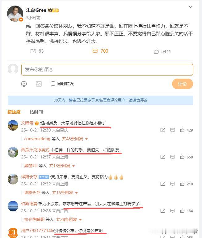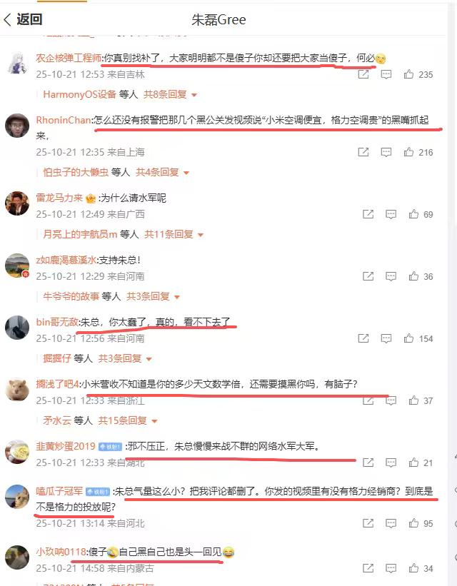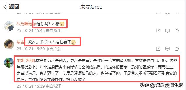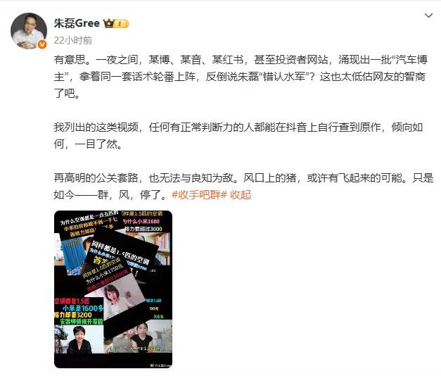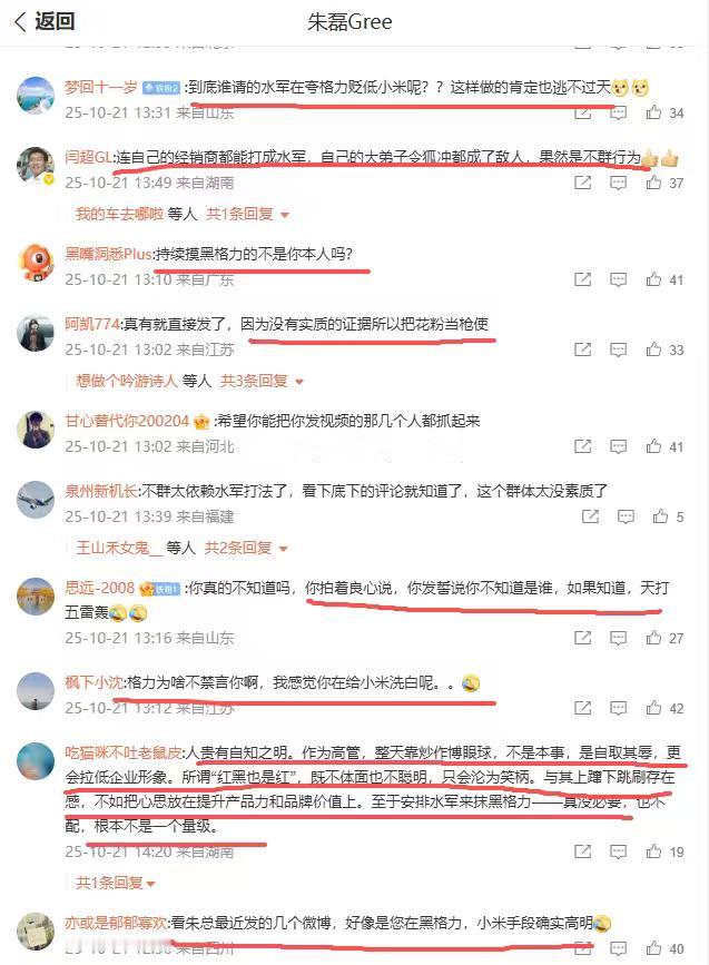 格力的朱磊好像是找到了涨粉的密码,关于小米和抹黑格力的不群话题讨论一直不断,更是在短时间内连发了好几条微博。 结果评论区比听相声都热闹,总有点越描越黑的感觉,看来语文学的不好的人,还是不要玩网络了,更不能做公关了啊,不然给企业带来大麻烦。 现在到底是格力黑小米,还是小米在黑格力,其实大家心里多少都有答案了,有些企业过度营销,夸大宣传,已经不是什么新鲜事了,懂得自然懂。 如果说这位网友的评论被他删除了,那么是不是有点做那什么心虚啊?无缘无故为何要删评论呢?难道是不小心误删的? 不要被网友给说中了,难道真的是,抹黑格力不是别人,更不是雷军,是他们一言堂的董大姐,其次是朱本人。格力这些年经营情况每况愈下,难道真的是消费者不看好格力空调的品质吗,还是他们的董大姐一系列的骚操作? 为什么会给人一种高高在上,太自以为是感觉。更是让别人认为董大姐身边真的是聚集了一批只会溜须拍马的人,导致她听不到、看不到真实的情况,整天活在他们虚幻的数量中,搞的跟土皇帝似的? 你们还是自己欣赏下面的评论吧,这些都不是我乱说的,有截图为证! 如有冒犯格力的,请联系我删除,我家也在用格力空调。[捂脸]