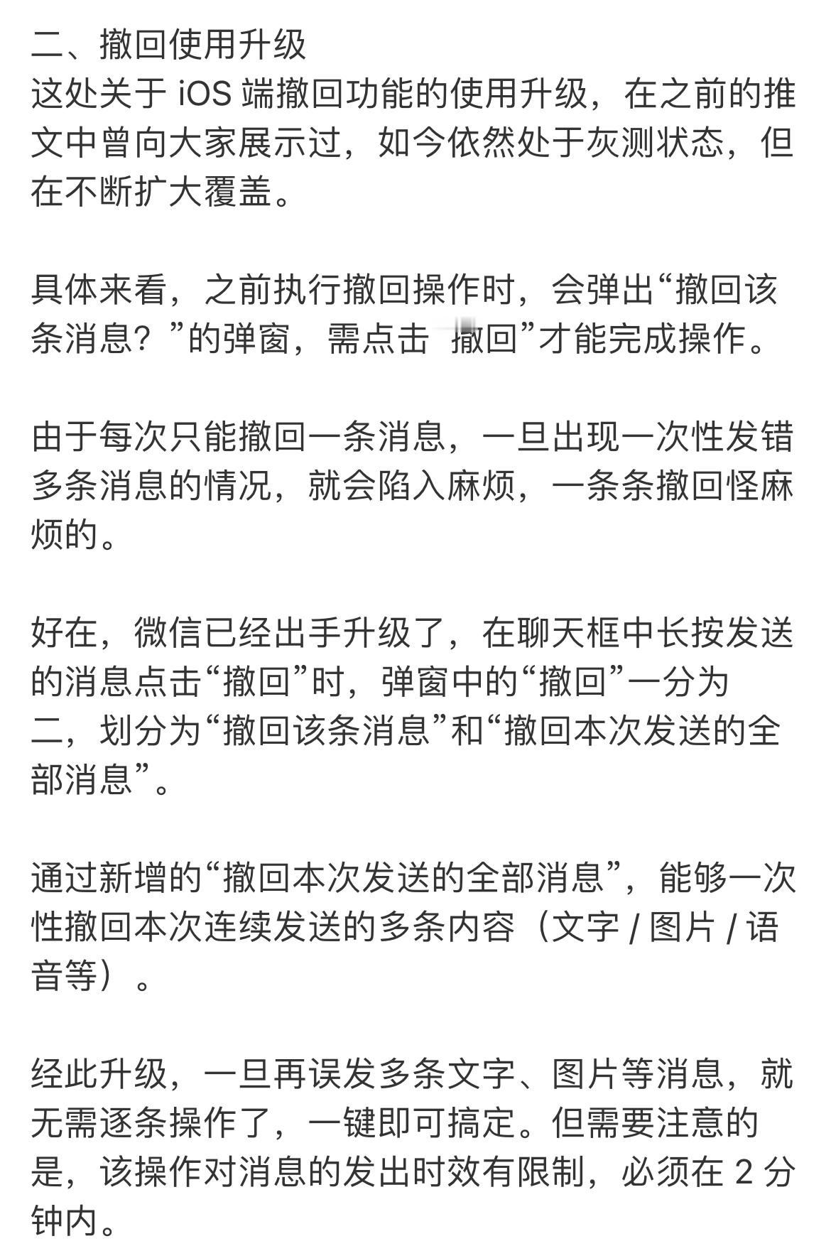 微信在近期启动了多项灰度测试,三个新功能悄然上线中:群聊彻底勿扰、一键全部撤回、存储空间。个人感觉都是很需要[委屈],另外想问问消息撤回能不能不要提醒对方?你猜我为什么撤回呢….[委屈][委屈]