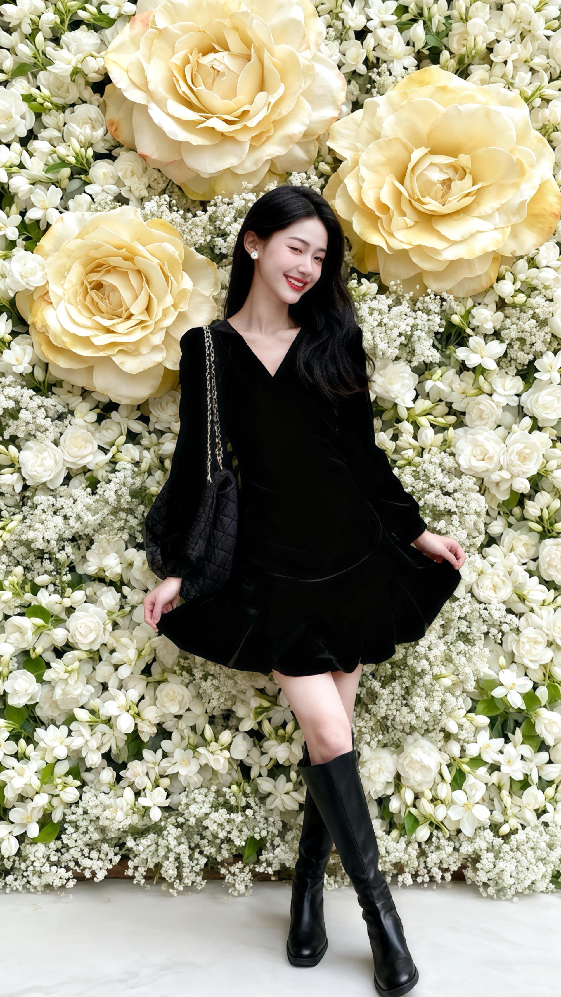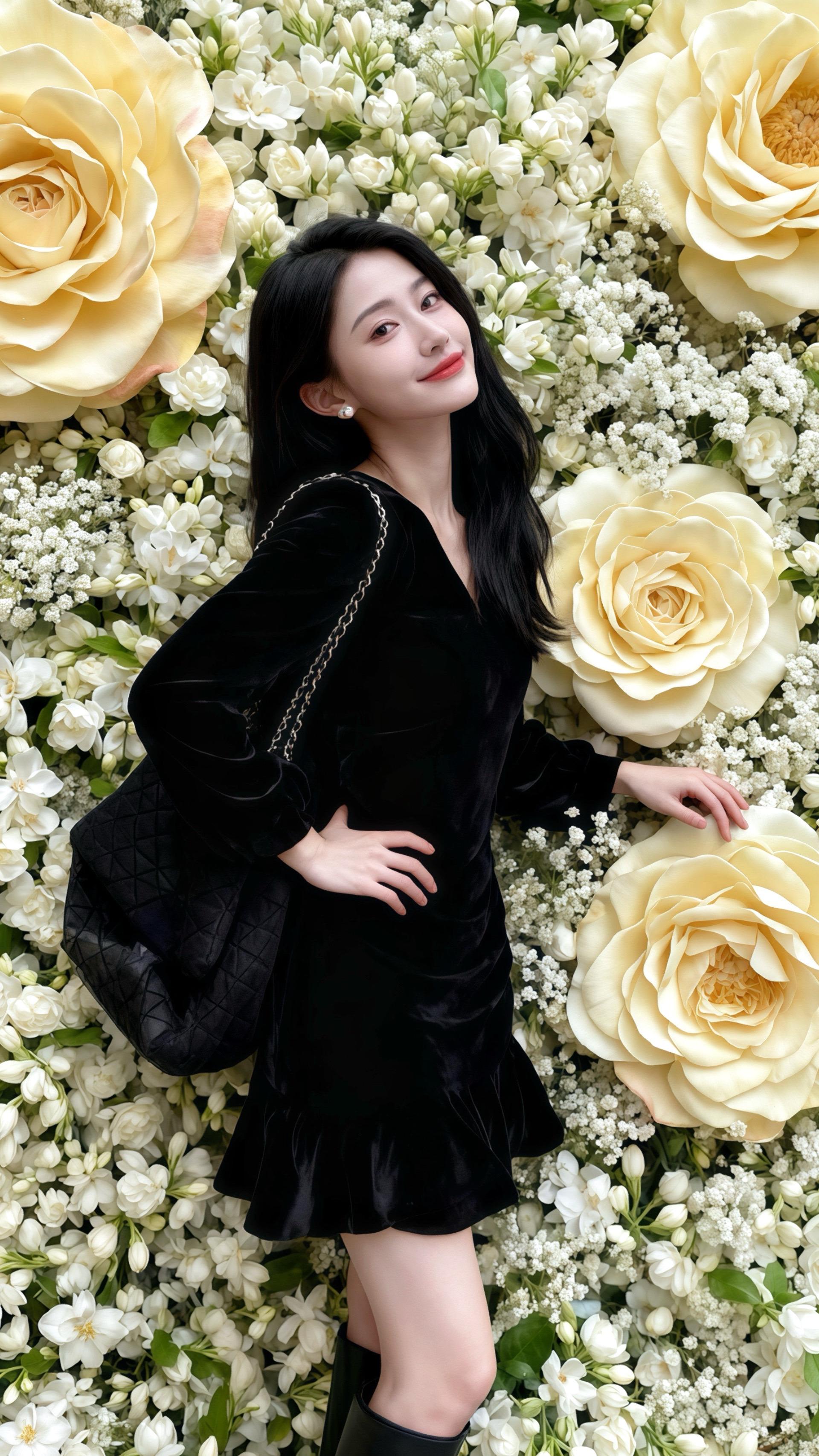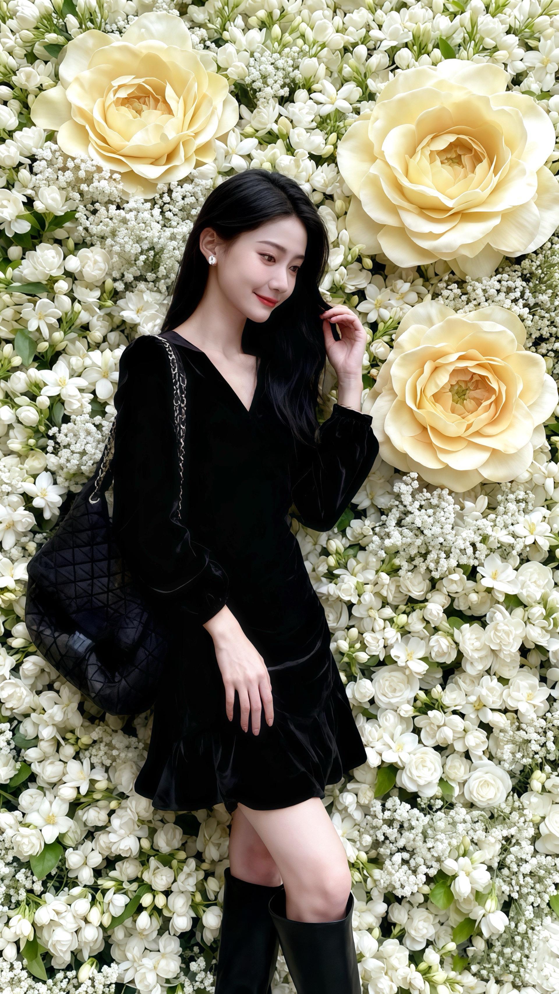 午后,她站在花墙前,身后是精心布置的茉莉与奶黄玫瑰,浪漫又精致。丝绒裙的光泽在光影里流转,搭配黑色长靴与菱格包,每一处细节都透着法式的奢华梦幻。她忽而侧身回眸,忽而轻提裙
