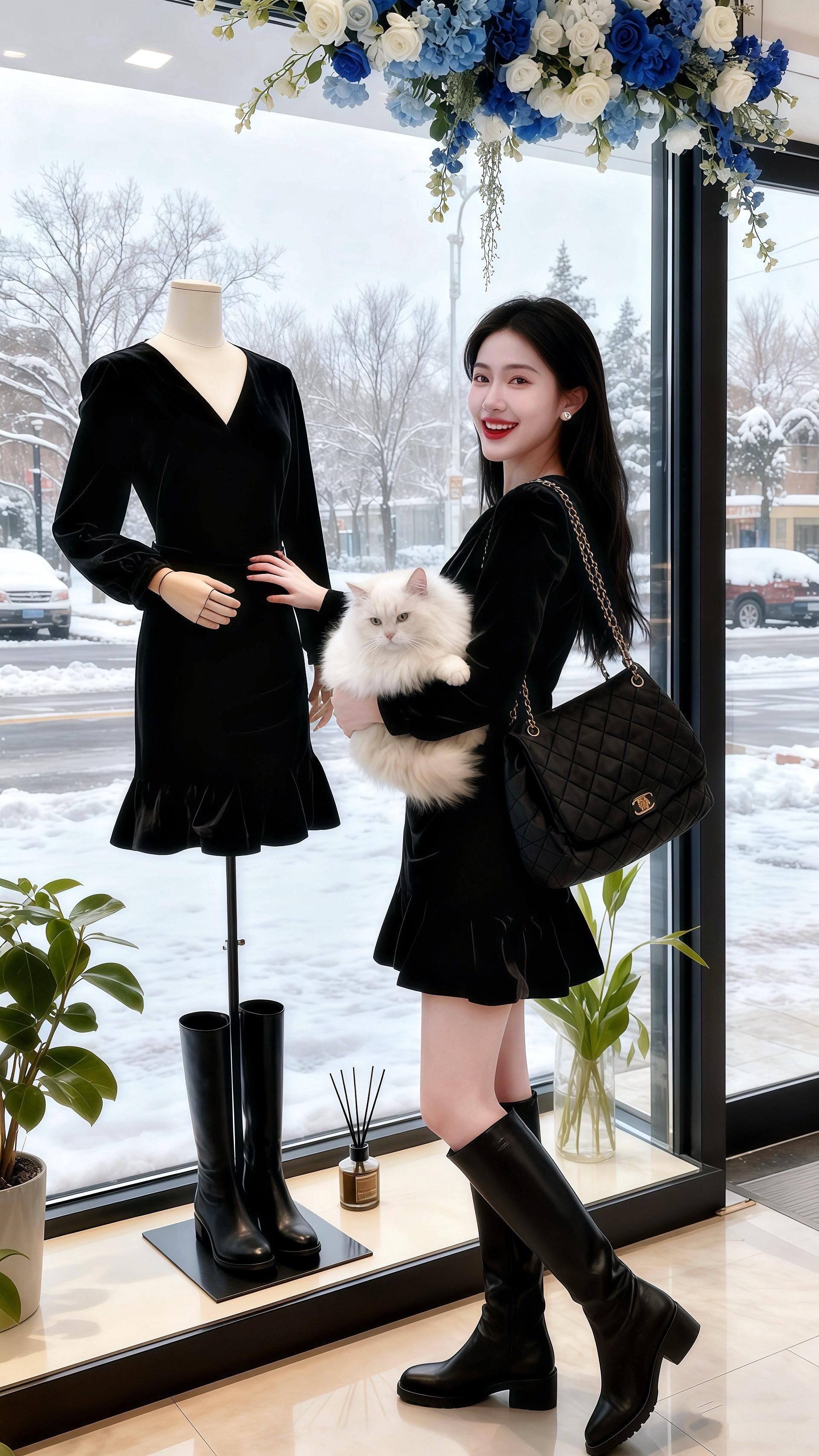 一日,初雪悄然降临,给街道覆上一层银白。林溪身着同款丝绒裙,在店内忙碌。她时而驻足于人体模特旁,轻抚裙装,感受面料的丝滑;时而抱着店里那只慵懒的白色长毛猫,在花墙与雪景的映衬下,笑容明媚。