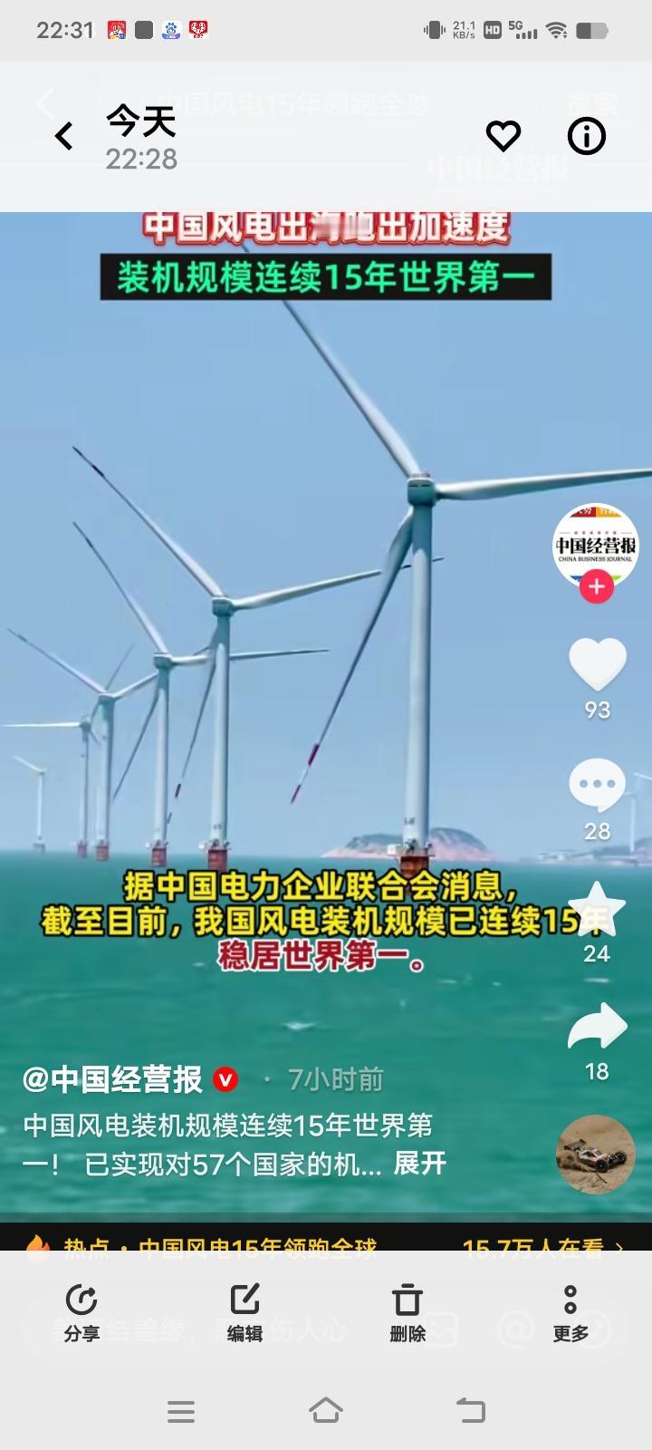 中国风电15年领跑全球 在全球能源转型的大潮中,我国风电产业正以令人瞩目的速度迈向新的高峰。截止目前,我国风电装机规模已连续15年稳居世界第一,这一令人震惊的纪录彰显了我国在可再生能源领域的雄厚实力和坚定决心。多年来,风电产业的持续高速发展不仅为我国能源结构的优化提供了有力支撑,也为实现绿色低碳的未来目标奠定了坚实基础。 数据显示,截至目前,我国风电新增并网容量已超过5700万千瓦,具体数字为五千七百零八万千瓦。这一庞大的数字背后,是全国范围内广大风电场的建设与投产,更代表着我国在新能源开发利用方面取得的重大突破。累计并网容量已突破五点八亿千瓦,占据全国发电总容量的15.7%,意味着风电已成为我国能源结构中不可或缺的重要组成部分。 更值得一提的是,规模以上企业的风电发电量占到全社会用电总量的10.1%,显示出风电产业的规模化、专业化水平不断提升。随着技术的不断成熟和规模的不断扩大,风电正逐渐成为我国电力供应的重要保障,为经济发展提供了清洁、可持续的动力源泉。 我国风电行业正进入一个崭新的发展阶段,年均新增装机容量不断攀升,逐步迈入“亿千瓦”时代。这一“新时代”意味着,我们的风电装机规模正以每年数千万甚至上亿千瓦的速度增长,彰显出我国在新能源领域的巨大潜力和发展动力。 未来,随着技术不断创新和政策的持续支持,风电产业的规模还将迎来更大突破。预计到2035年,我国非化石能源的消费占比将达到30%以上,风电和太阳能的装机容量将比2020年增长六倍以上,力争突破36亿千瓦的大关。这一目标的实现,将极大推动我国能源结构的绿色转型,减少对传统化石能源的依赖,迈向低碳、环保的能源未来。 我国提出到2035年非化石能源在能源消费中的比例达到30%以上,这是国家对绿色低碳发展的坚定承诺。在这一宏伟蓝图中,风电作为主要的可再生能源之一,将扮演着至关重要的角色。 为了实现这一目标,国家不断优化风电产业的政策环境,加大基础设施建设力度,推动技术创新,提升风电的发电效率和经济性。同时,鼓励企业加大研发投入,推动海上风电、陆上风电的深度开发,以实现风电装机容量的持续攀升。 尽管我国风电产业取得了令人瞩目的成就,但在快速发展的同时,也面临一些挑战。例如,风电资源的空间分布不均、技术水平的提升、风电场的智能化管理、以及电网的接入和调度能力等问题,都是行业亟需解决的难题。 然而,随着科技的不断进步和政策的持续扶持,这些挑战逐渐变成了新的机遇。智能化、数字化、绿色化的风电技术将不断涌现,为行业提供新的动力。同时,国际合作也为我国风电产业带来更多的技术交流和市场拓展空间。 展望未来,我国风电产业正站在新的历史起点上。随着装机容量的持续攀升,技术水平的不断提升,以及绿色能源战略的深入实施,风电将在我国能源结构中扮演更加关键的角色。我们有理由相信,通过不懈努力和创新突破,我国的风电事业必将迎来更加辉煌的明天,为全球绿色低碳发展贡献更大力量。 在绿色能源的蓝图中,风电正扬起希望的风帆,迎风破浪,驶向更加光明的未来。让我们共同期待,一个清洁、美丽、可持续的能源世界正逐步走向现实! 新能源 风力发电 绿色低碳