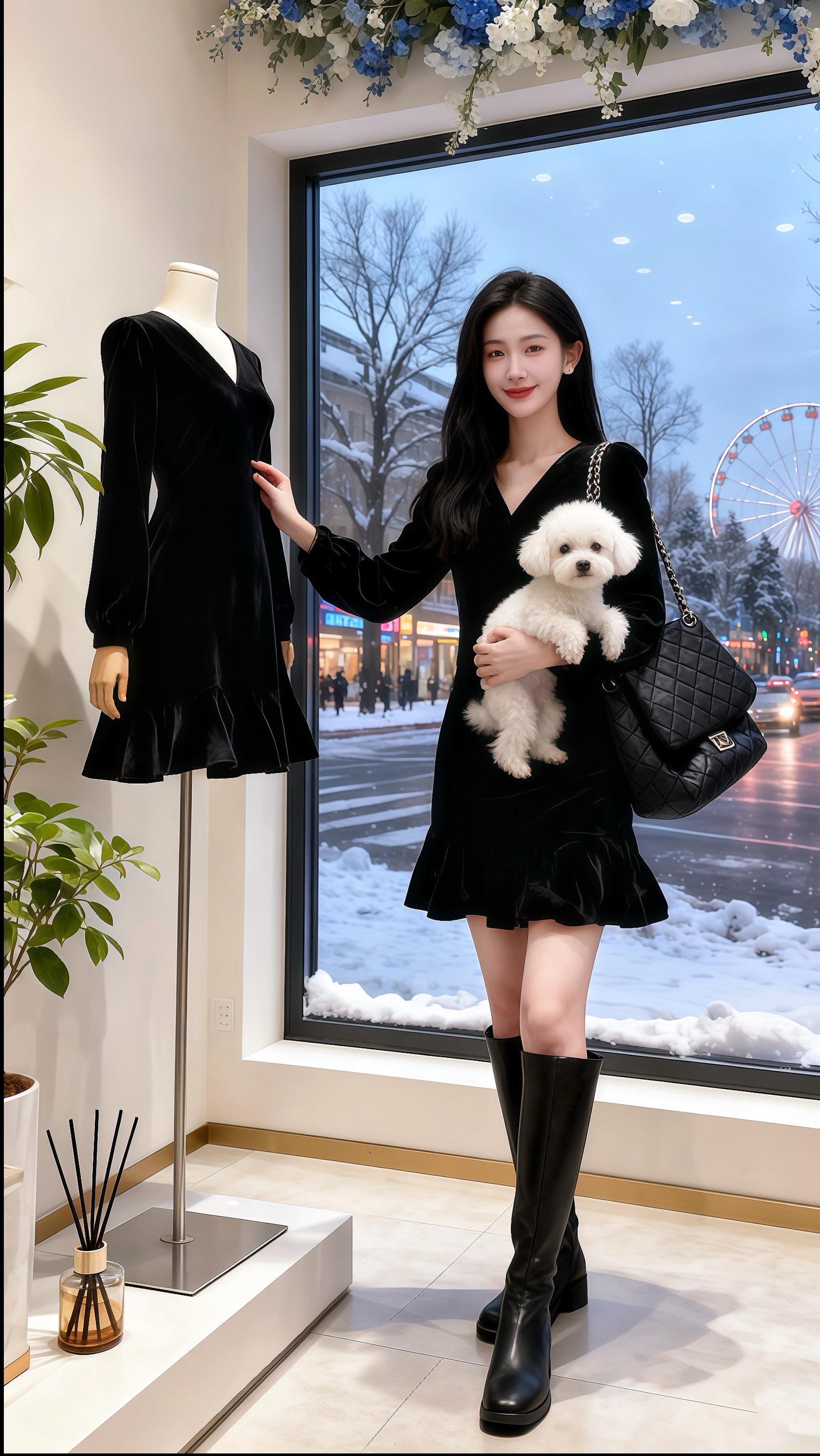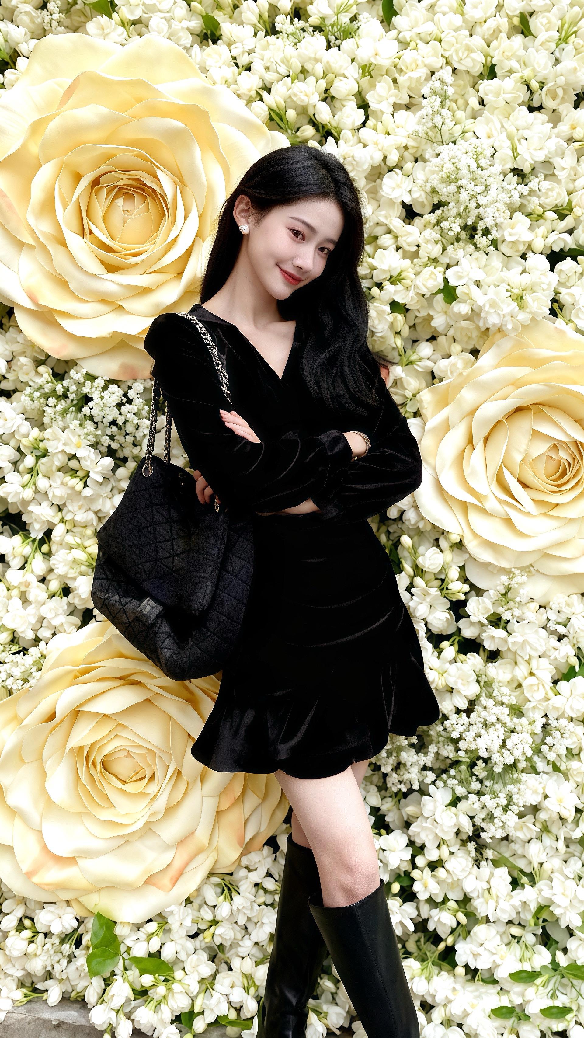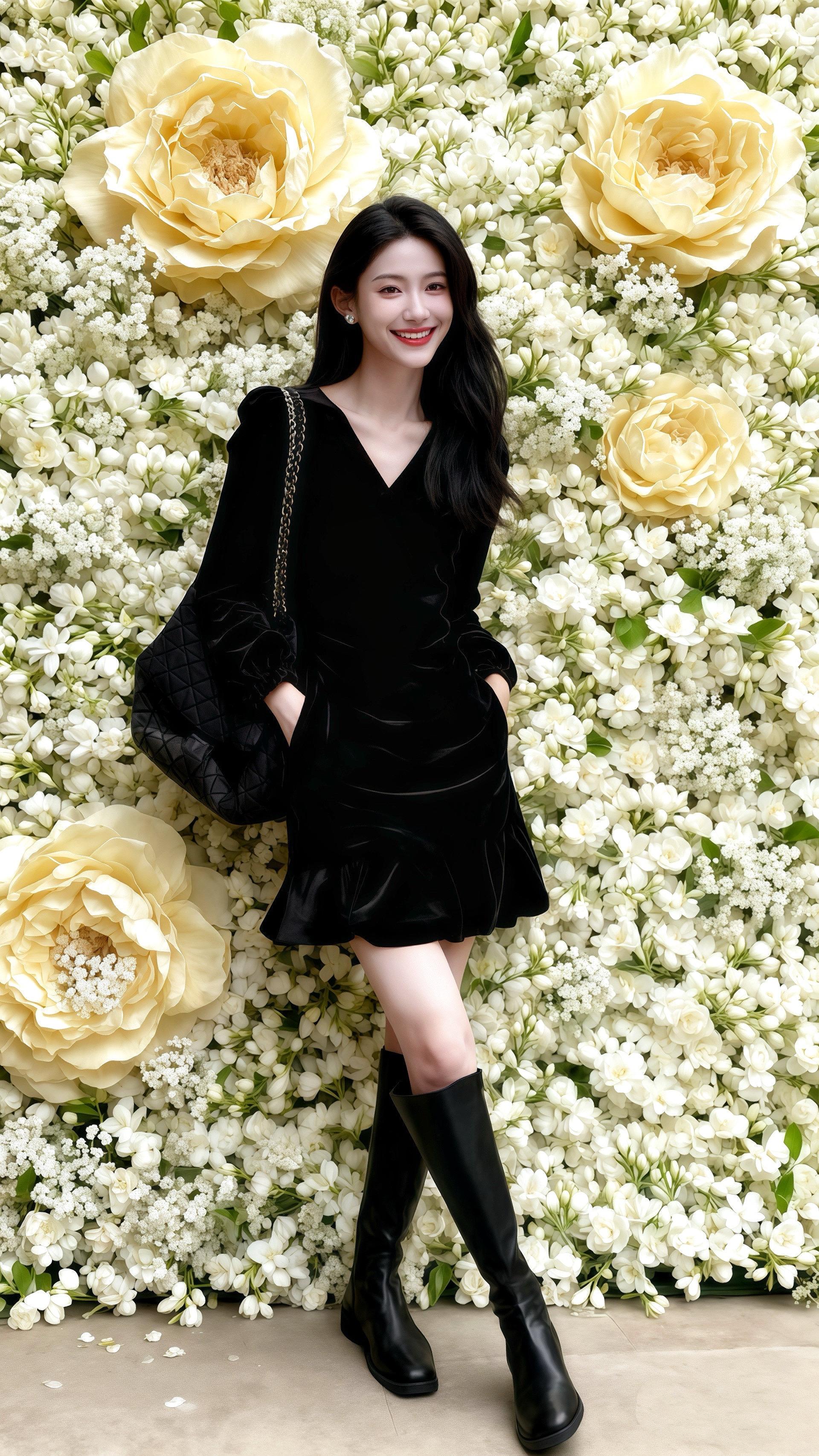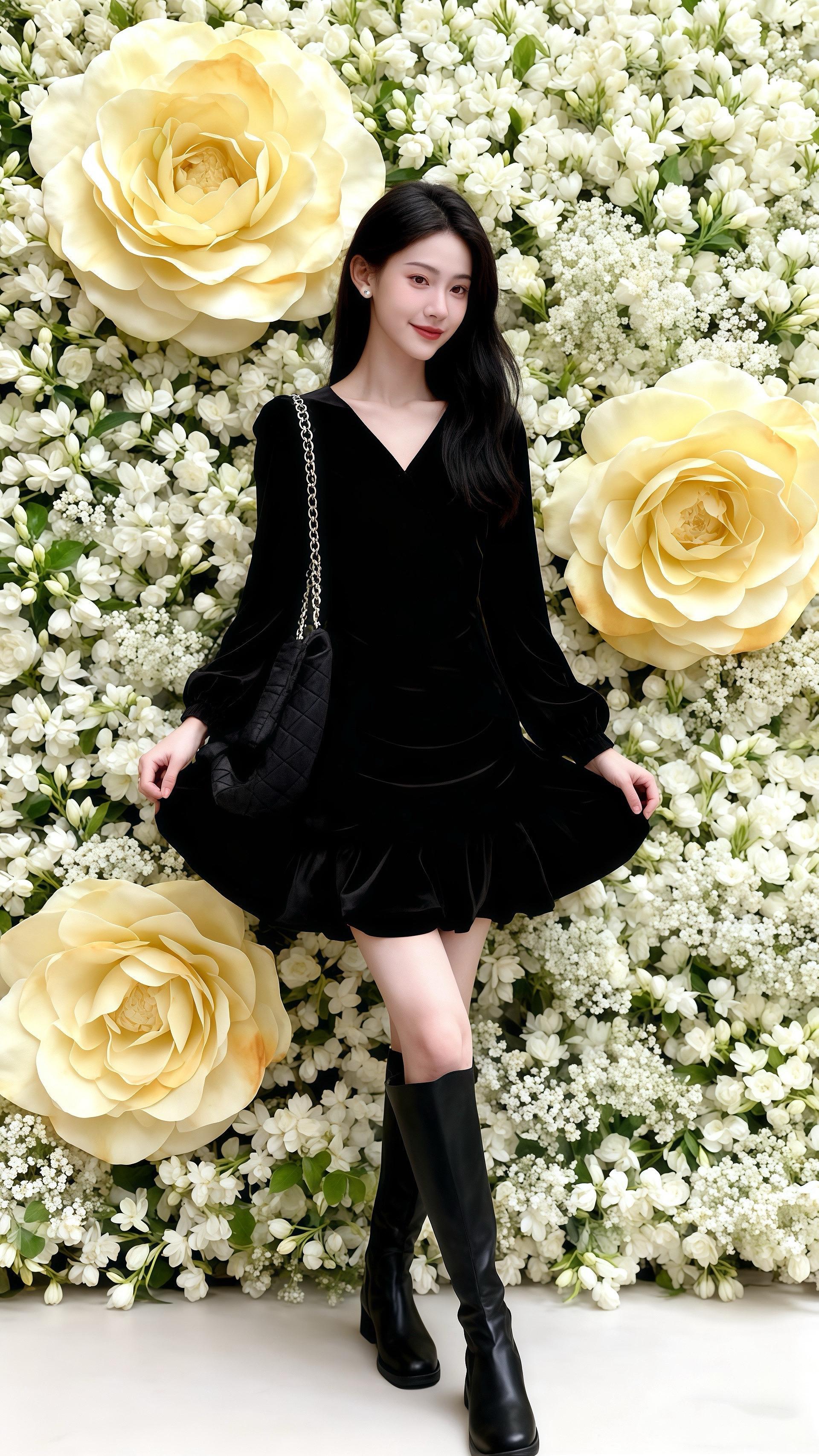 许妍回眸,皓明指尖轻轻拂过她的袖口:“丝绒的质感很特别,配上这长靴,又甜又有气场。”她轻笑,任由他牵着手在花墙前踱步,奶黄色的大花在阳光下晃眼,像极了他看她时的眼神。