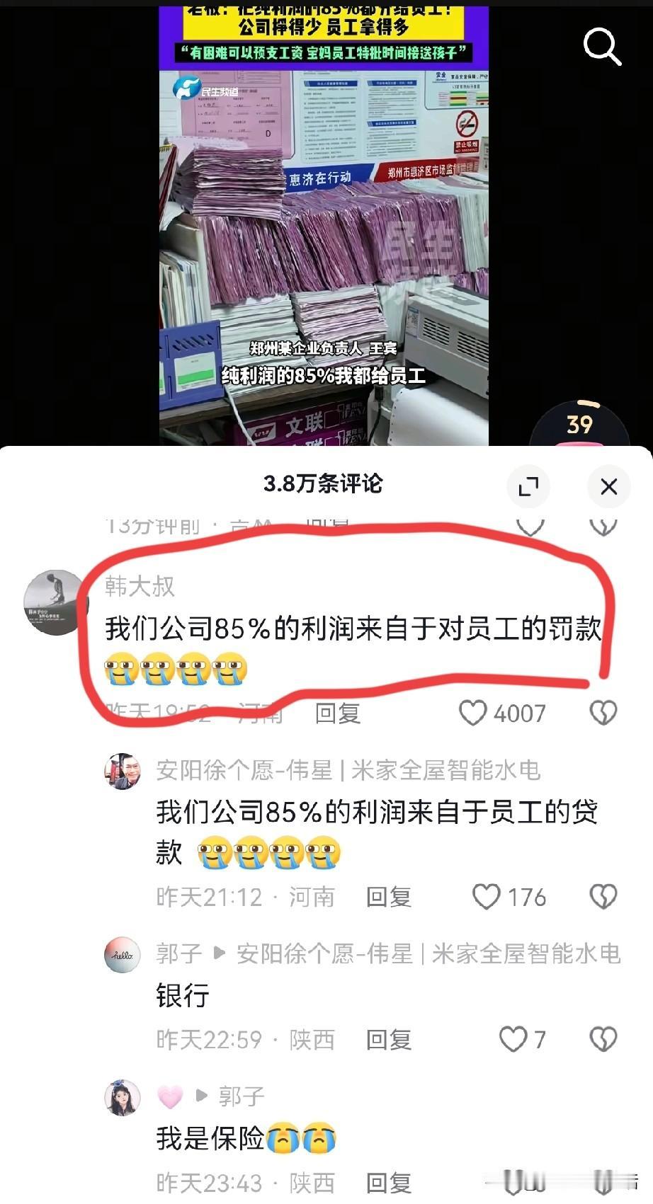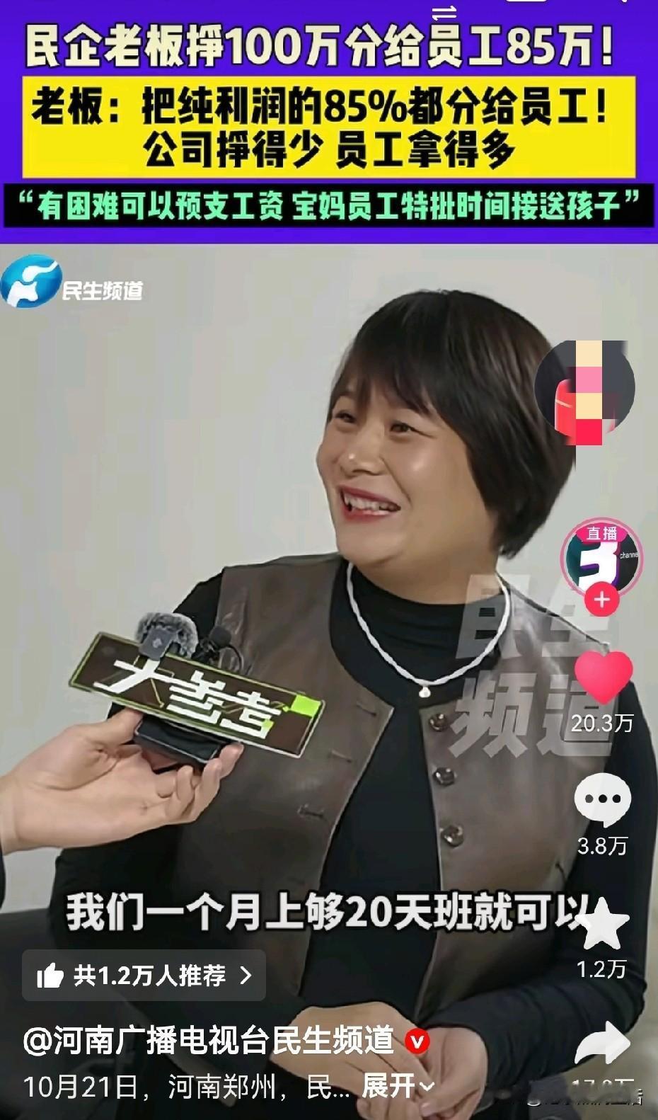 又是别人家的老板!这样的公司只能在网上看到。 你以为河南一企业将利润的85%分给员工就算厉害了? 下面的做法更是直呼打工人的天堂,每天再也不用担心会迟到、早退会罚款了,下班接孩子,也不用再麻烦父母代劳了,甚至每个月只要上20天的班就够了。 家里缺钱?提前给你预支工资行不行? 这样的企业,简直就是来给员工发福利的,如果大家都争相效仿,打工人的幸福指数将直线上升,还怎么可能会有焦虑、抑郁、家庭矛盾冲突呢。 每个月挣的钱比别人多,工作时间比别人少,还有什么理由不快马加鞭赶效率啊,要知道老板每多挣一块钱,就有他们的八毛五,那动力不比什么大饼都受用。 每天有足够的时间带娃、遛娃、做饭、享受生活,会少了多少家庭矛盾,再也不用为了谁接孩子而争论了,也不会因为没人送孩子上辅导班的郁闷了。 只可惜,这样的老板,一般人只能在抖音看到,可遇不可求啊,咱们还有很多老板,就像评论区说的一样,企业85%的利润是来自员工的处罚。 更是有人感叹,为什么好企业都在河南,不如多问问自己能不能成为这样的好老板吧! 与其羡慕别人,不如改变自己。