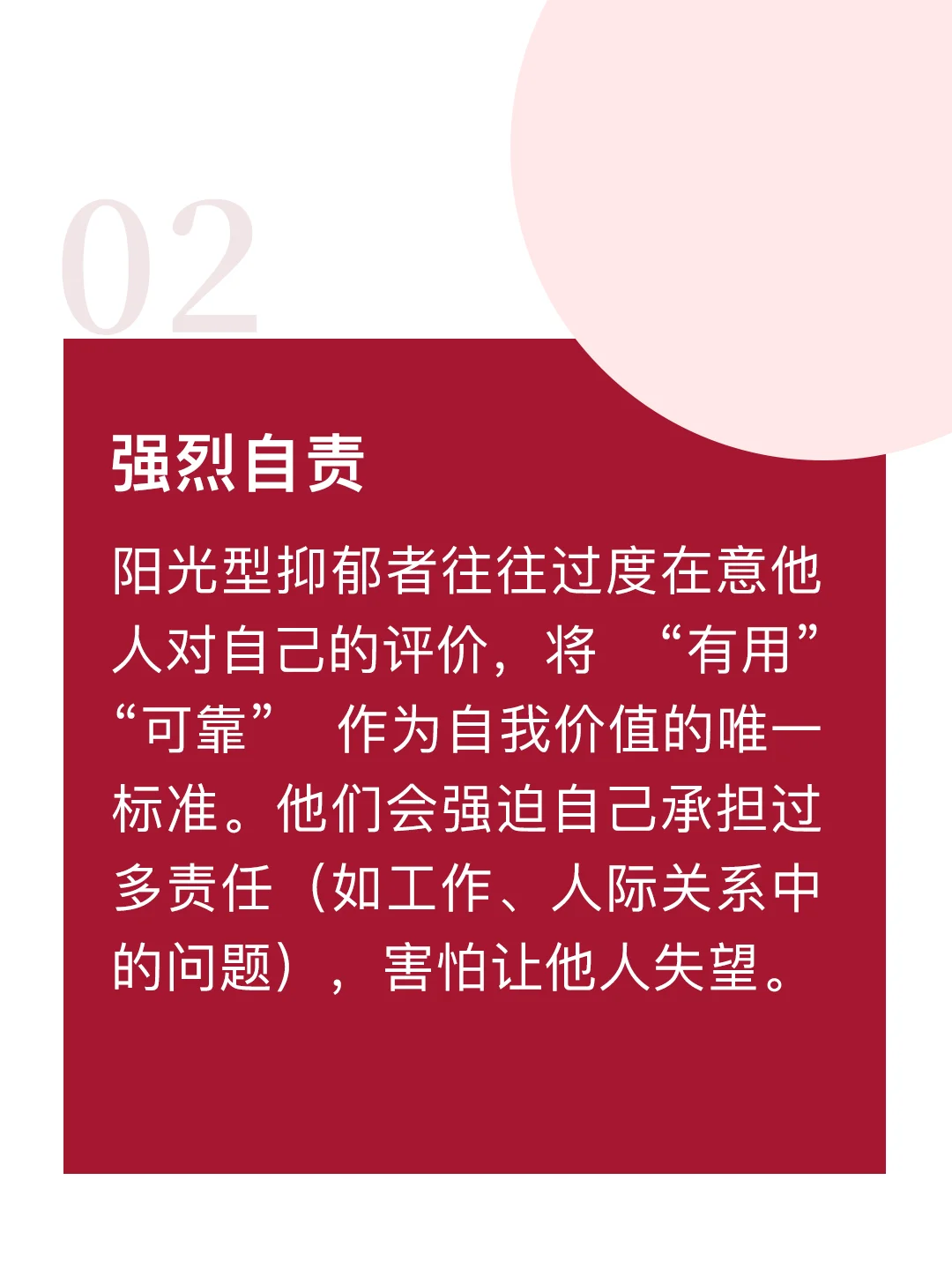 阳光型抑郁者往往过度在意他人对自己的评价,将 “有用”“可靠” 作为自我价值的唯一标准。他们会强迫自己承担过多责任(如工作、人际关系中的问题),害怕让他人失望。