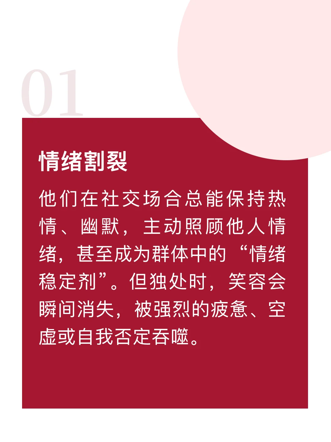 他们在社交场合总能保持热情、幽默,主动照顾他人情绪,甚至成为群体中的 “情绪稳定剂”。但独处时,笑容会瞬间消失,被强烈的疲惫、空虚或自我否定吞噬。