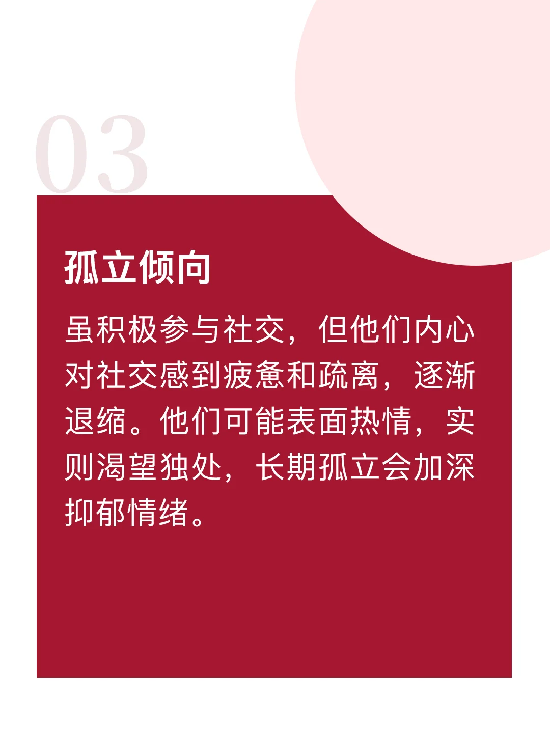 虽积极参与社交,但他们内心对社交感到疲惫和疏离,逐渐退缩。他们可能表面热情,实则渴望独处,长期孤立会加深抑郁情绪。