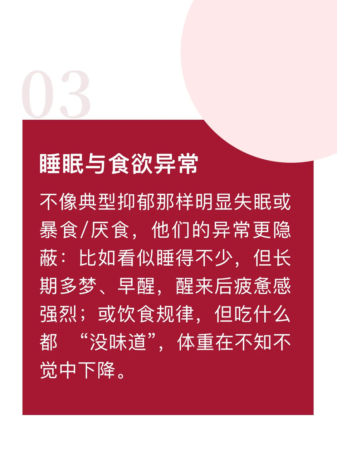 不像典型抑郁那样明显失眠或暴食/厌食,他们的异常更隐蔽:比如看似睡得不少,但长期多梦、早醒,醒来后疲惫感强烈;或饮食规律,但吃什么都 “没味道”,体重在不知不觉中下降。