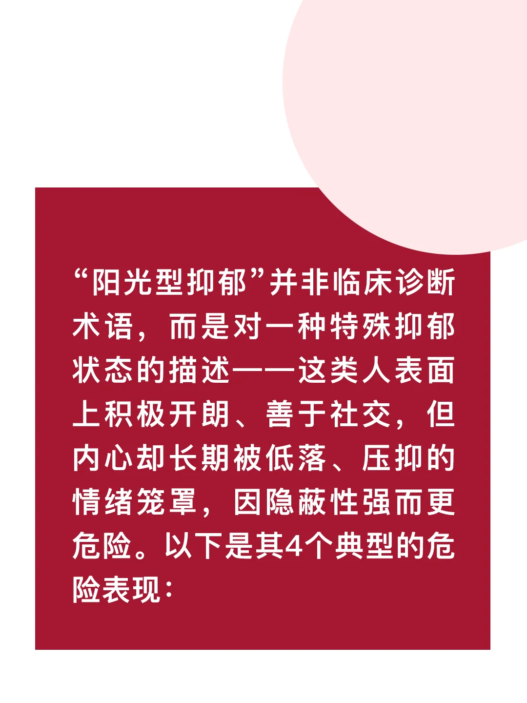 “阳光型抑郁”并非临床诊断术语,而是对一种特殊抑郁状态的描述——这类人表面上积极开朗、善于社交,但内心却长期被低落、压抑的情绪笼罩,因隐蔽性强而更危险。以下是其4个典型的危险表现: