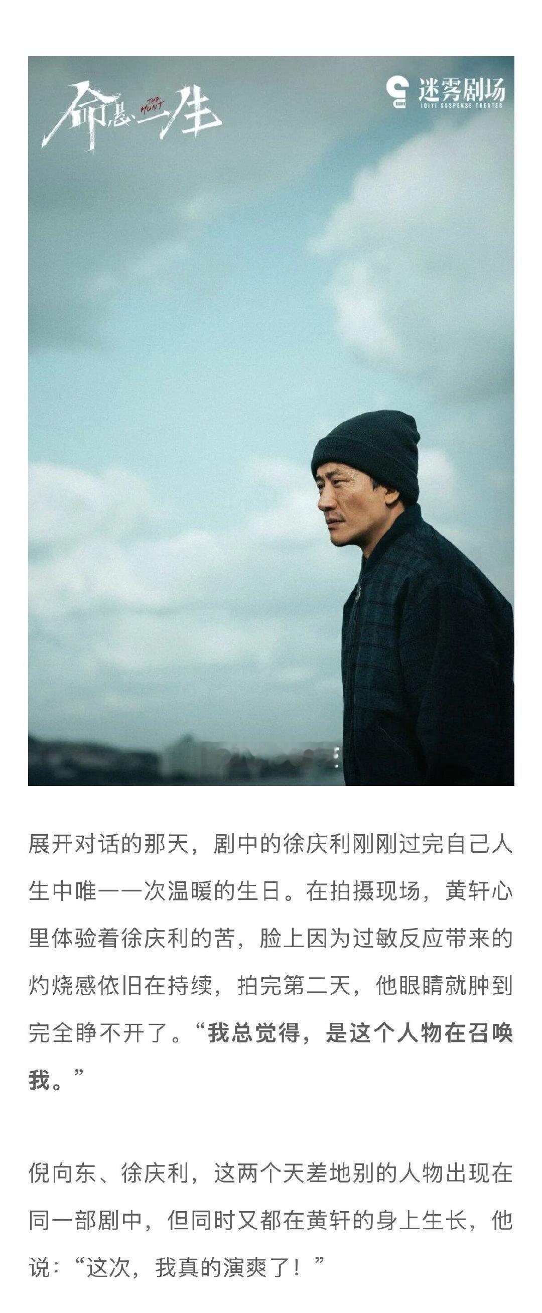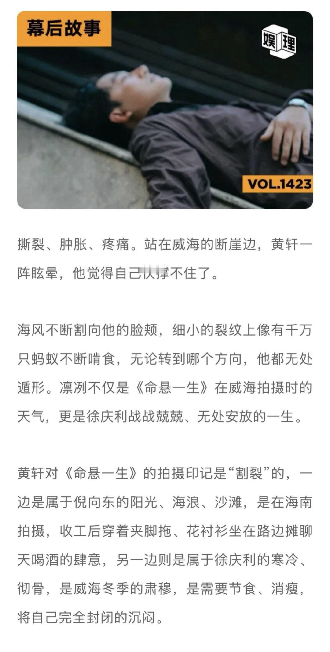黄轩谈命悬一生演爽了黄轩对命悬一生的拍摄印记 谈对命悬一生的拍摄印记是“割裂”的,一边是属于倪向东的阳光、海浪、沙滩,是在海南拍摄,收工后穿着夹脚拖、花衬衫坐在路边摊聊天喝酒的肆意,另一边则是属于徐庆利的寒冷、彻骨,是威海冬季的肃穆,是需要节食、消瘦,将自己完全封闭的沉闷。