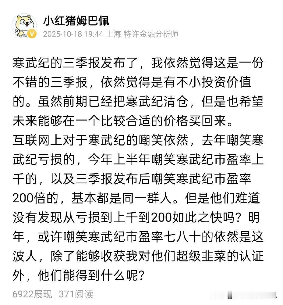 从这三天的走势来看,市场和我持比较一致的观点,认为寒武纪这份三季报是比较出色的。