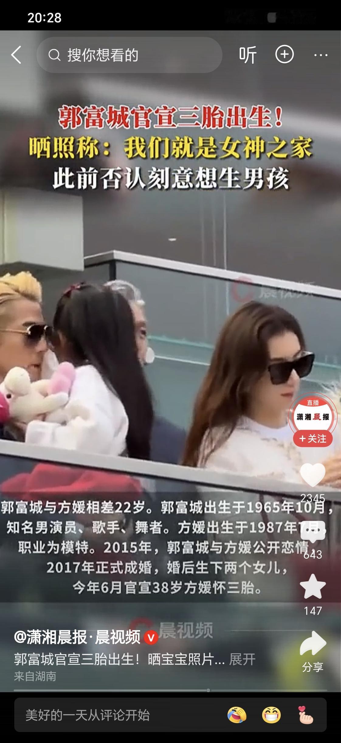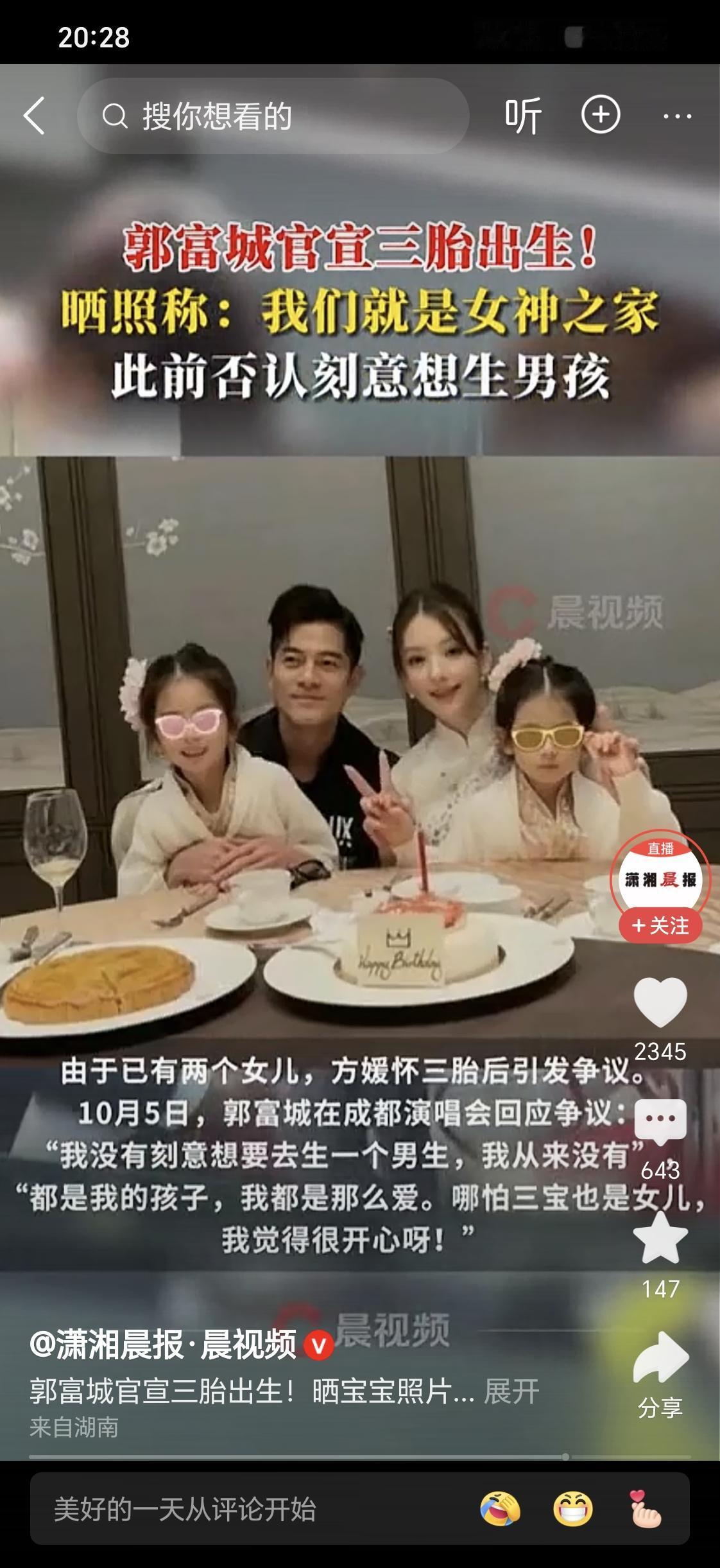 郭富城还要怀四胎生儿子吗? 就在大家觉得郭富城郭天王三胎要生一个儿子的时候, 方媛又给他生下了第三个女儿, 一家里面除了郭天王外全是女神, 漂亮的女宝宝。 郭富城大喊我们就是“女神之家”! 无论男女都不骨肉亲情! 对于郭寅城而言,多养几胎也是有能力与实力的, 像方媛这么漂亮这么青春靓丽, 基因特别好, 多生几胎也是轻轻松松的, 没有任何的经济压力![赞][赞] 天王嫂怀孕 方媛