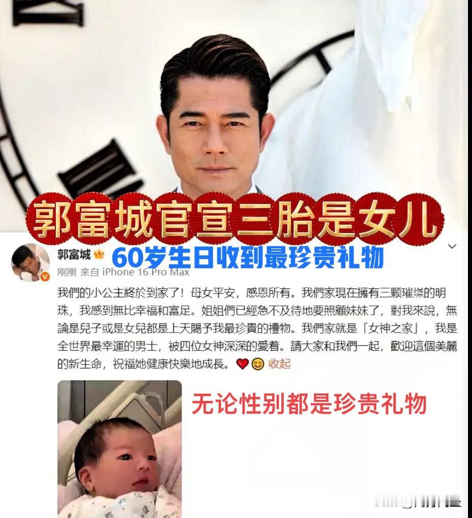 郭富城60岁生日前喜迎第三胎 10月26号是郭富城六十岁的生日,在2025年10月22日郭富城通过社交媒体正式宣布三女儿出生。 郭富城年近六十再添女儿,有人猜测,夫妇俩生三胎的初衷或许是为求子。 郭富城1965年10月26日出生于中国香港,是九十年代香港乐坛“四大天王”之一。 郭富城已经有了两个女儿,分别是九岁和七岁,随着三女儿的出生,郭富城的家里拥有了“三颗璀璨的明珠”,他称自己的家是 “女神之家” 。 在中国人的传统家庭观念里,儿女双全乃人生幸事。 郭富城与妻子方媛感情稳定,三胎是顺其自然的结果。他曾多次表示孩子是上天恩赐,无论性别都是珍贵礼物。 他们夫妇决定生三胎更多是出于对家庭和孩子的热爱,而非单纯追求儿子。