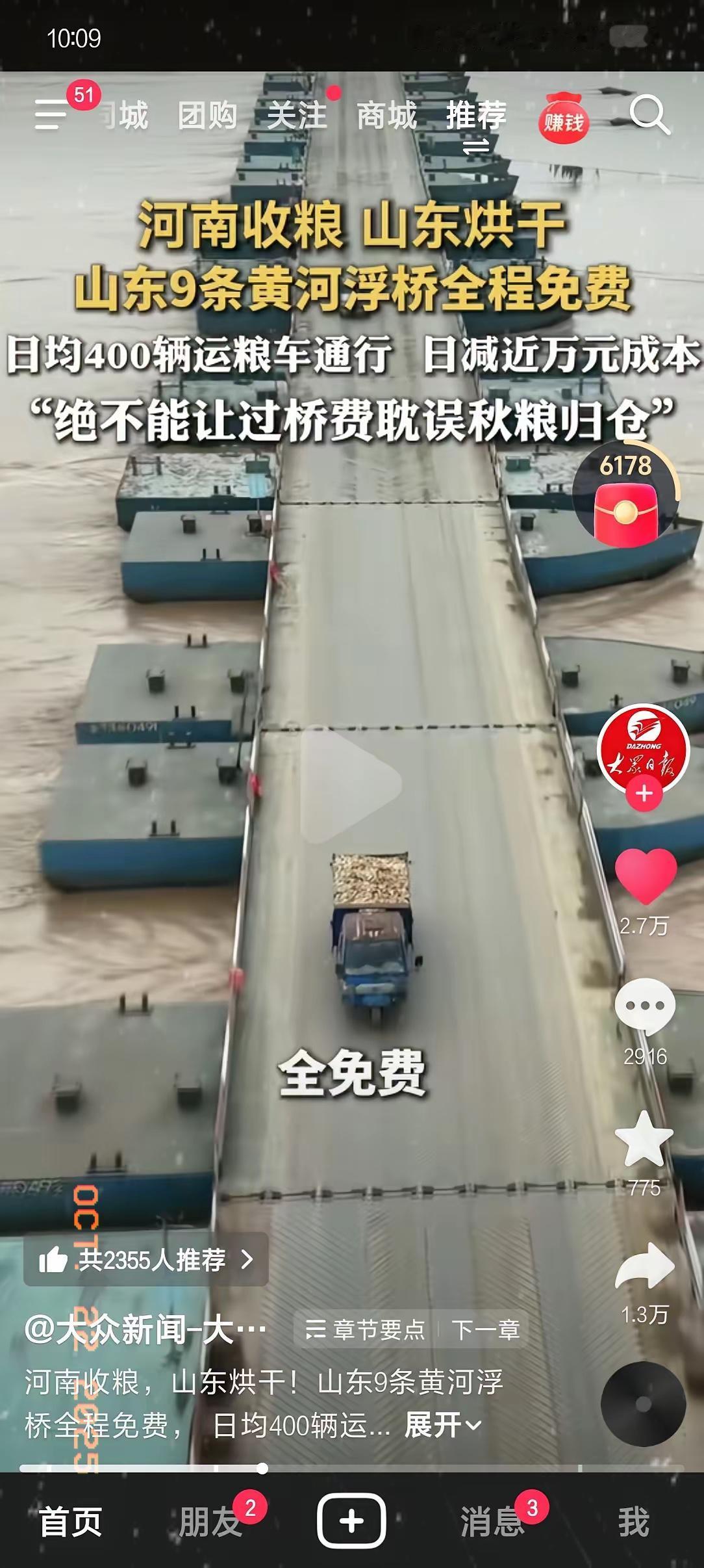 山东这哪是责任心泛滥 分明是把“帮邻居渡难关”刻进DNA里了!河南粮食被雨泡得快发芽,急得农民直跺脚,山东一听说,立马把9条黄河浮桥全免了费,让河南老乡拉着粮食直奔郓城烘干,听着河南农民连喊“山东太好了”,这股实在劲儿谁看了不佩服? 别以为这是临时凑热闲,山东向来没短板,疫情时多少省市收到过它送的蔬菜水果?各地救灾它也总抢在前面。这哪是“作秀”,是打心底懂“农民靠粮活,耽误不得”,更认“邻里好,赛金宝”的理儿——帮人从来不带虚的,全是实打实的行动。 你们身边有没有山东朋友?或者见过山东这样的暖心事儿?评论区聊聊,咱也夸夸这份让人踏实的担当! 山东 齐鲁山东