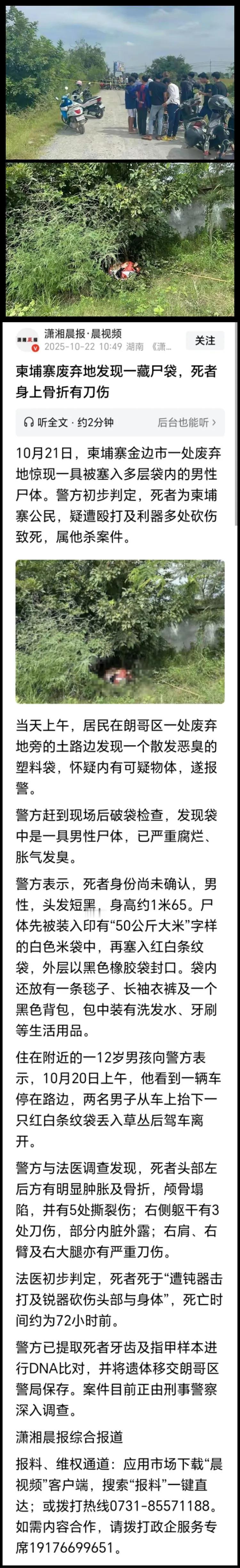 抛尸![发怒] 柬埔寨,再发命案! 据官媒报道,2025年10月21日,在柬埔寨金边市一处废弃荒地土路旁,有人发现一个袋子,里面一具高度腐败尸体,具体情况详见图片。 下面,我们通过网上文字记载和现场照片,进行推理分析,还原其中一些细节,您看看有无道理。 1、两个袋子 尸体虽然个子不高,才165厘米,但也是男性,可以装50公斤大米的袋子,估计容量不够大,人塞进去不容易系口,人体就会露在外面,于是又套了一个大号袋子,然后把袋子口系上,目的有两个,一个是掩饰尸体不被发现,另一个就是便于搬运尸体。 2、原始现场 袋子中除了有尸体,还有毯子、背包、衣服、洗漱等物品。说明物品与死者有关系,或者上面沾附大量血迹,所以一同毁尸灭迹;当地气温高,毯子肯定不是盖的,有可能当褥子,加上死者随身携带洗漱物品,提示流浪、居无定所等情况;如果尸体赤裸,衣服与尸体分离状态,提示死者可能脱了衣服,有可能是睡眠状态。 3、受伤顺序 死者头部左侧软组织肿胀,提示头部受伤时候,人还活着;颅骨塌陷,提示钝性巨大暴力,有可能是铁锤。头部受伤后,头部左侧巨大外力,加上人本能挣扎,人体就会翻转体位,把身体右侧露出来,所以刀伤位于右侧,但是人体右侧损伤部位太多,右躯干、右肩、右臂、右大腿均有刀伤,说明人当时就失去抵抗能力,被砍时候身体没有来回打滚,更说明颅脑损伤在前,一锤下去人就昏迷了。 4、作案人数 作案工具至少两种,一个锤子,一个刀具,尸体躯干创口处,脏器外露,说明创口很大,提示刀具力量足,有可能是砍的动作,砍刀或菜刀类可能性大。按常理分析,携带两种工具,一人带一种较合理,目击证人发现抛尸者为两人,也侧面证实了当时作案人数至少两人。 以上分析,依据官媒文字材料推理,因材料太少,有很大的局限性,您就当烧脑锻炼,咱一切以官方报道为准。