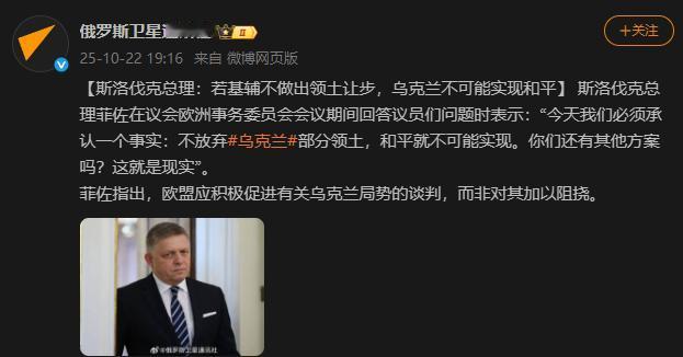 斯洛伐克总理说出了关键问题! 10月22日,俄罗斯卫星通讯社报道,斯洛伐克总理:若基辅不做出领土让步,乌克兰不可能实现和平,欧盟应积极促进有关乌克兰局势的谈判,而非对其加以阻挠。 斯洛伐克总理菲佐说出了一个很现实的问题,无论是乌克兰还是欧洲国家都应该好好考虑这个问题,领土问题已经成为俄乌问题是否能解决的关键点。 俄乌冲突的根子就是领土那点事,2014年克里米亚“公投入俄”是导火索,这三年多打下来,俄罗斯实打实控制了乌克兰约19%的土地,除了克里米亚,顿巴斯地区好几个州也攥在手里。 这些地儿不只是地图上的色块,黑海沿岸的军事要塞是战略要地,普京还老说新领土是俄罗斯历史的一部分,把民族主义情绪拉得满满当当,再看军事层面,乌克兰2025年夏天的反攻看着热闹,可独立机构评估下来,实际推进的地盘根本没达预期。 反观俄罗斯,靠消耗战慢慢啃,国防部自己报的数据都显示今年已经占了快5000平方公里。这种“温水煮青蛙”的打法,让乌克兰喊的恢复领土完整越来越像句空话。 更麻烦的是,双方在领土上都没退路,俄罗斯这边,梅德韦杰夫这些高层天天放话丢新领土就是叛国,国内早就形成共识;乌克兰那边更绝,泽连斯基政府2022年就修了法,明明白白说不能谈领土割让,法律把路堵得死死的,谈判桌上连点商量的余地都没留。 而领土问题僵着,最难受的其实是欧洲,菲佐敢说这话,说到底是欧洲的“援助疲劳症”已经藏不住了,德国基尔研究所的数据摆在那儿,2025年夏天欧洲给乌克兰的军事援助,每个月的平均值比上半年跌了一半还多。 这不是故意卡脖子,是真扛不住了,欧盟统计局显示,欧元区通胀还挂在5.3%的高位,德国汽车业第三季度出口额同比掉了8.7%,老百姓早开始抱怨,凭啥要为一场看不到头的战争掏腰包? 斯洛伐克自己更是难上加难,作为东欧小国,它本来就靠俄罗斯能源过日子,乌克兰断了俄罗斯的天然气输送后,斯洛伐克只能买更贵的美国液化天然气,光过境费每年就亏5亿欧元,更糟的是乌克兰的便宜农产品涌进欧洲市场,斯洛伐克的农民根本没法比,生意一落千丈,这种杀敌一千自损八百的制裁,换谁当总理都得急。 而且,现在欧洲内部吵得很厉害,匈牙利总理欧尔班天天反对对俄制裁,说自己国家亏了几十亿欧元;波兰这些东欧国家又死撑着帮乌克兰,怕领土换和平开了坏头,天天窝里斗把欧洲的迷茫暴露得明明白白。 反正现在看来,乌克兰接受领土反而是及时止损,泽连斯基政府该醒醒了,以现在的军力,想把丢的地全夺回来根本不现实,与其把青壮年耗在战场上,不如把钱和人投到重建经济、升级国防上,等有了实力,以后在外交上才有底气。 至于对欧洲,也别再无底线给援助了,推着双方谈判才是真对乌克兰负责,要是欧洲自己因为能源危机垮了,乌克兰的领土完整再喊得响,也没人当回事。 说到底,菲佐这席话,其实是撕了欧洲政治正确的遮羞布,是接着抱着意识形态不放,还是睁大眼睛面对现实?这不仅是乌克兰要选的路,更是整个欧洲的考题。