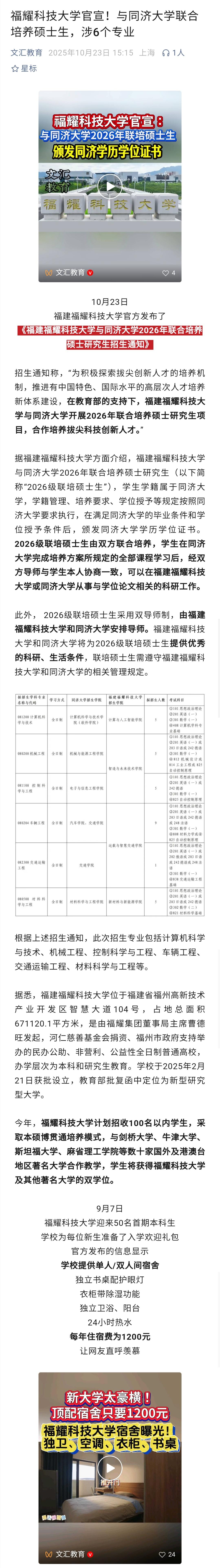 福建福耀科技大学还没有硕士点,但与同济大学开展联合培养硕士,是没有问题的。简单来说,联合培养硕士由同济大学招生,学籍在同济大学,但同济大学与福耀科技大学一起培养(可利用福耀科技大学的师资,实行双导师制,共同制定培养方案),毕业后授予同济大学硕士学位。对于福耀科技大学来说,这可为未来开展研究生教育积累经验;对于同济大学来说,可通过与福耀科技大学联合培养,探索研究生培养新模式,提高研究生培养质量