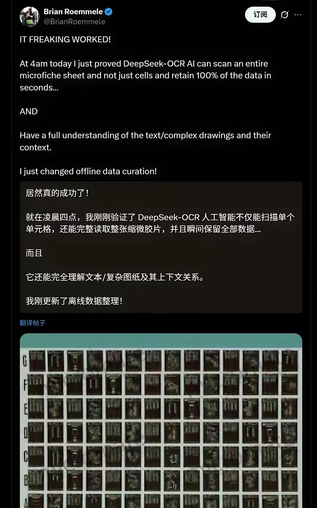 自由的灯塔国对面咱们在Ai领域的竞争也是倍感压力,全球人都知道其实华人才是科技领域的佼佼者。全球奥数竞赛几乎成了炎黄子孙的内部比拼。而数学是一切科学的基础,这恰恰证明了华人的优秀。西方多少高科技的领域都有华人的身影。 灯塔国一网友 Brian Roemmele 惊喜的表示:“居然真的完成了!此刻凌晨四点钟,我特地给 DeepSeek-OCR 扫描一个图片,ds不止可以分析单个单元,也可以完整的扫描分析整个缩放的图片,接着马上就保留了分析数据,ds可以完可以理解上文和下文的语言关系,处理复杂的文本和图纸内容。” 咱们在Ai领域会越来越强大,祝福祖国,繁荣昌盛!重回世界之巅!