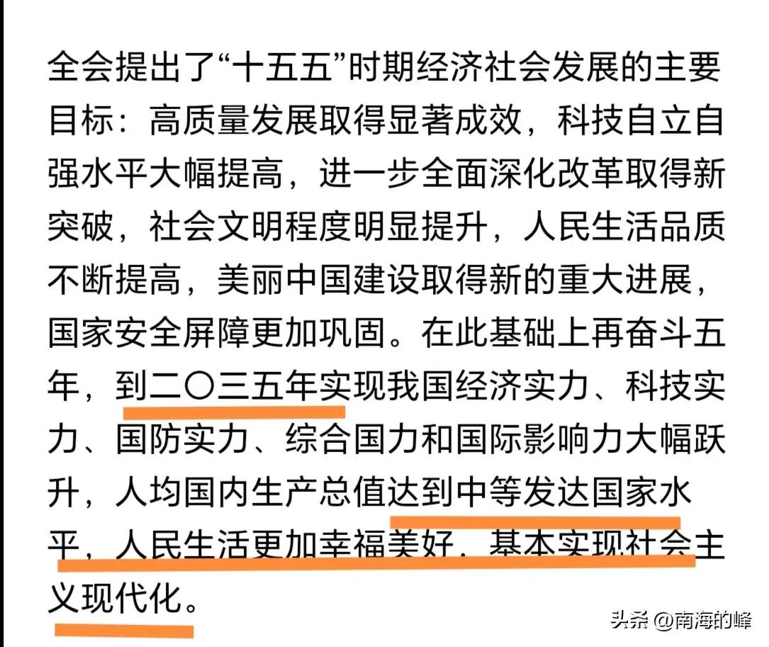 接下来的十年将会是我们一生中最幸福的十年。因为我们有幸生活在了这个时代。 四中全会公报,未来两个目标两件大事。一是推进祖国统一,说明接下来五年收台要有实质性动作了。二是十五五深化改革高质量发展,科技自立,再用五年时间,在2035年实现进入发达国家目标,实现社会主义现代化强国目标。 点右上角关注我,我们一起去看这个魔幻的世界