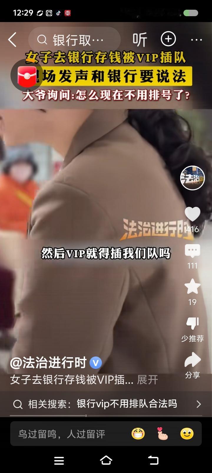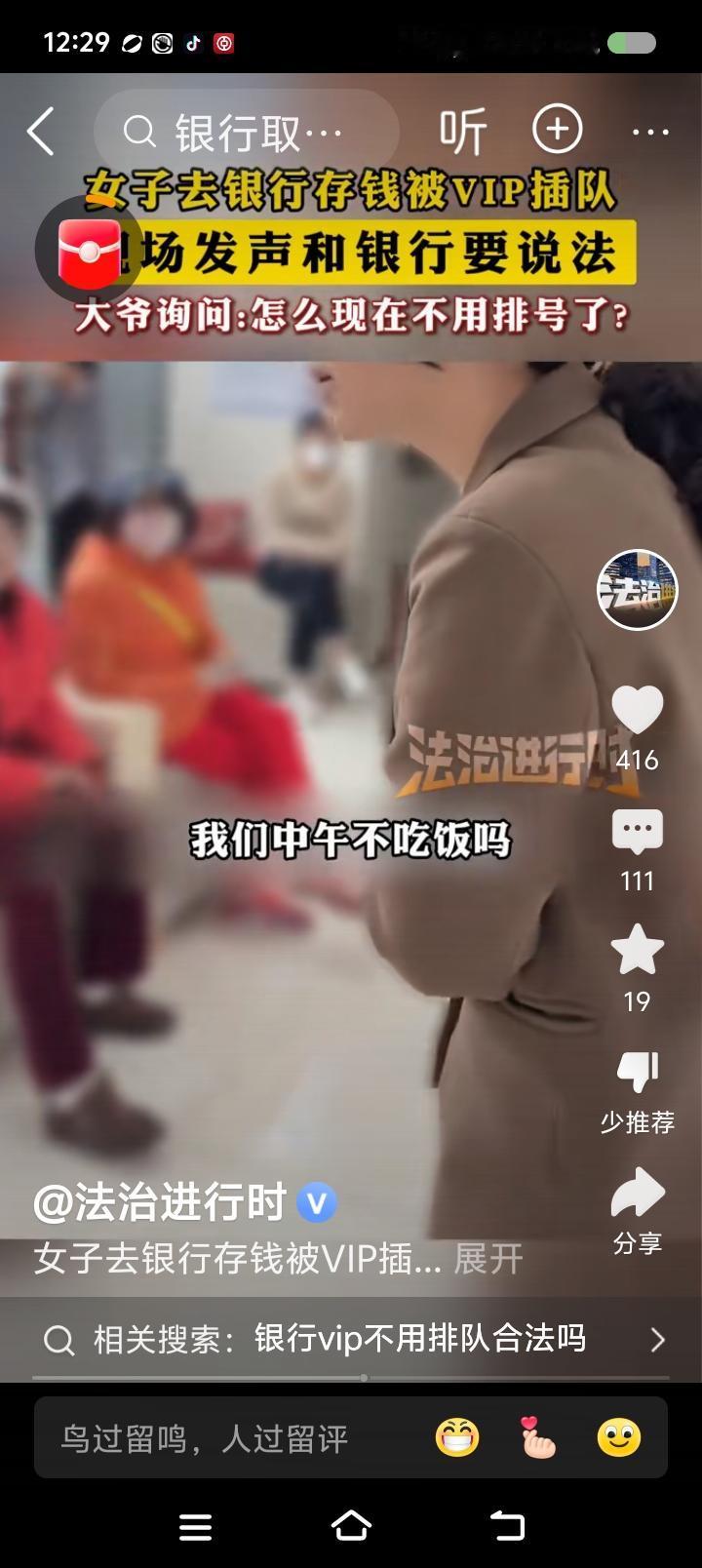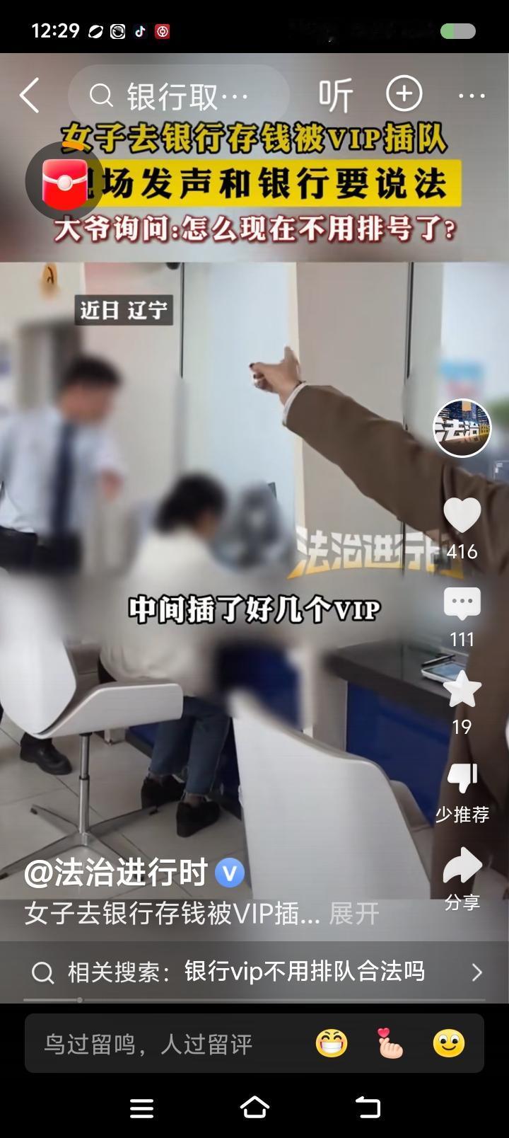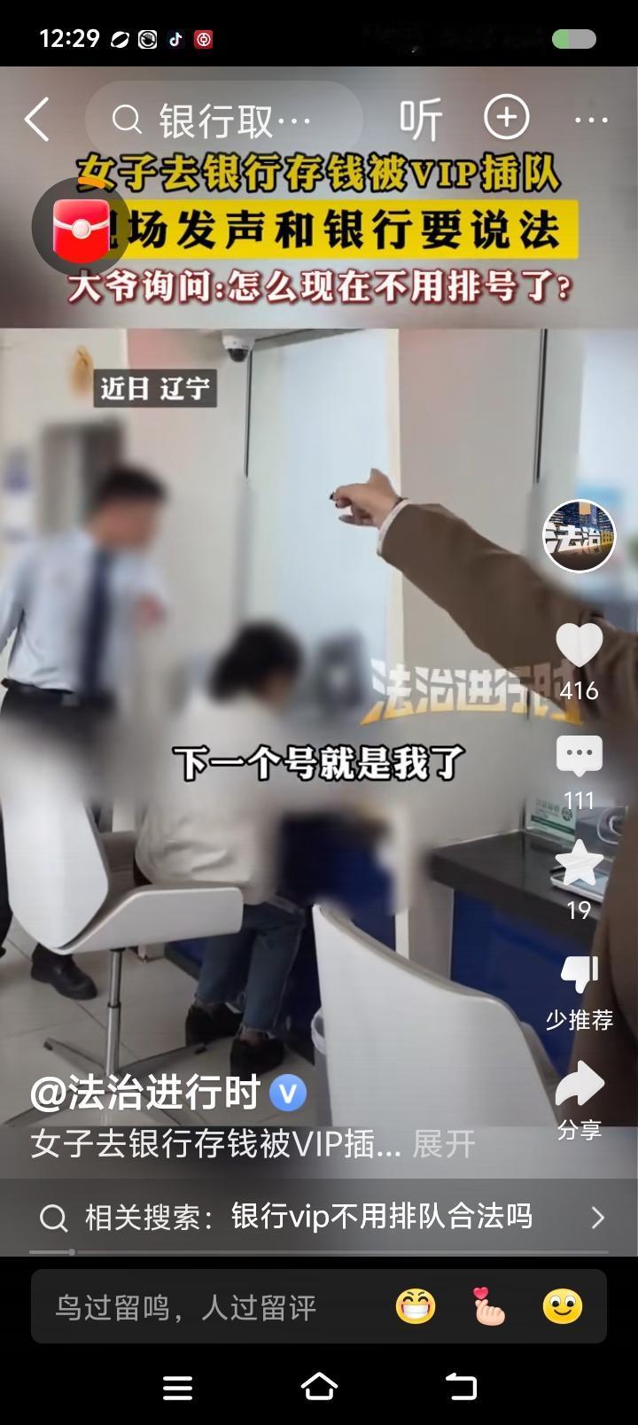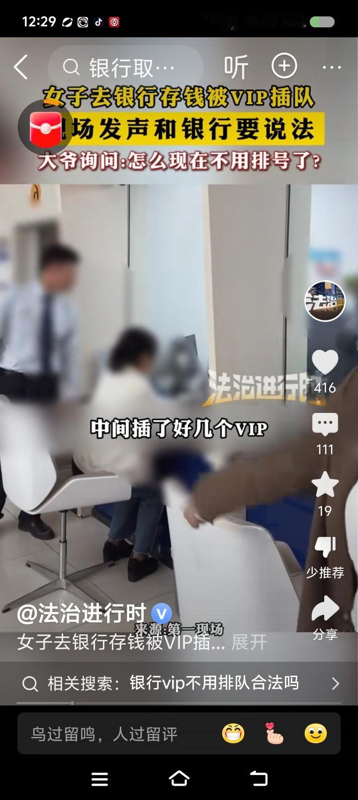 银行,你怎么这样?—— 据报道,某女子去银行办业金融机构,自动取款机坏了,去柜台办。快轮到她了,下面一个号是她,中间插了好几个VIP!她质问工作人员。 点评: 多少年了,这种现象! 窗口少,VIP随时插队,普通人去柜台办业务太慢了! 银行员工那么多,往往就那么两个窗口,中午吃饭剩一个窗口了。 网点多的银行还好点,就怕县城只有这一家,不得不去。 为什么老百姓反映的问题解决不了? 一、普通客户,银行不在乎。 二、你见过当地领导领工资吗?让他叫个普通的号,排一小时的队体会一下!