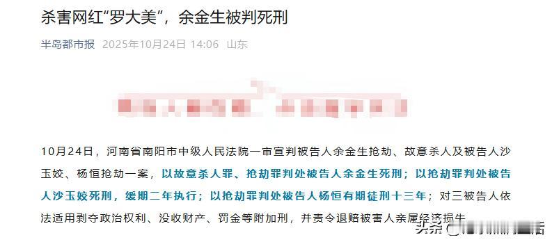 网红罗大美被害凶手获死刑! 三个凶手终于迎来了他们最后的审判,两个死刑,一个13年有期徒刑,并没收财产和罚金! 罗大美生前因为人美心善,被伪装成自己好朋友的余金生、沙玉娇敲诈勒索,并残忍的杀害,人神共愤! 罗大美,本名尚某锋,是河南许昌人,和胖东来是一个地方的,殁年仅有30岁。 他从艺校出身,是一名反串演员,2018年开始“反串”直播表演,凭借独特表演风格在短视频平台快速的积累粉丝超过百万。 在朋友和邻居眼中,罗大美一直都是个热心人。 在2021年他的老家河南郑州水灾时,他不仅捐款捐物,还连夜拉着邻居们为受灾地捐赠物资。 他的妹妹小尚回忆,哥哥总是无私帮助家人,支付她在大学期间的生活费,并告诉她:“在大城市上学开销大,不让你向父母要钱”。 罗大美案件向公众,尤其是网络名人揭示了安全漏洞:熟人并非全然可信。 此案中,三名被告人均与受害人有交集,利用相识关系降低其警惕性。 网络名人由于公开曝光度高,经济状况更为人知,更需提高安全防范意识。 在社交媒体上适度保持隐私尤为重要,避免公开炫耀财富或披露具体行踪。 对于粉丝量巨大的公众人物,考虑聘请专业安保团队,制定紧急情况预案,并非多余之举。 从艺校毕业生到百万粉丝网红,罗大美本可继续在舞台上绽放光彩;而法律的严正裁决,为他和他悲痛的家庭带来了等待两年的公道。 此案宣判后,不少网友在社交平台发文“正义终于到来”。 这起案件敲响了安全的警钟——无论是网红还是普通人,在纷繁复杂的网络时代,警惕性和安全意识从不多余。