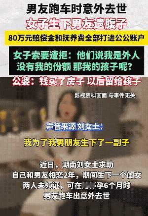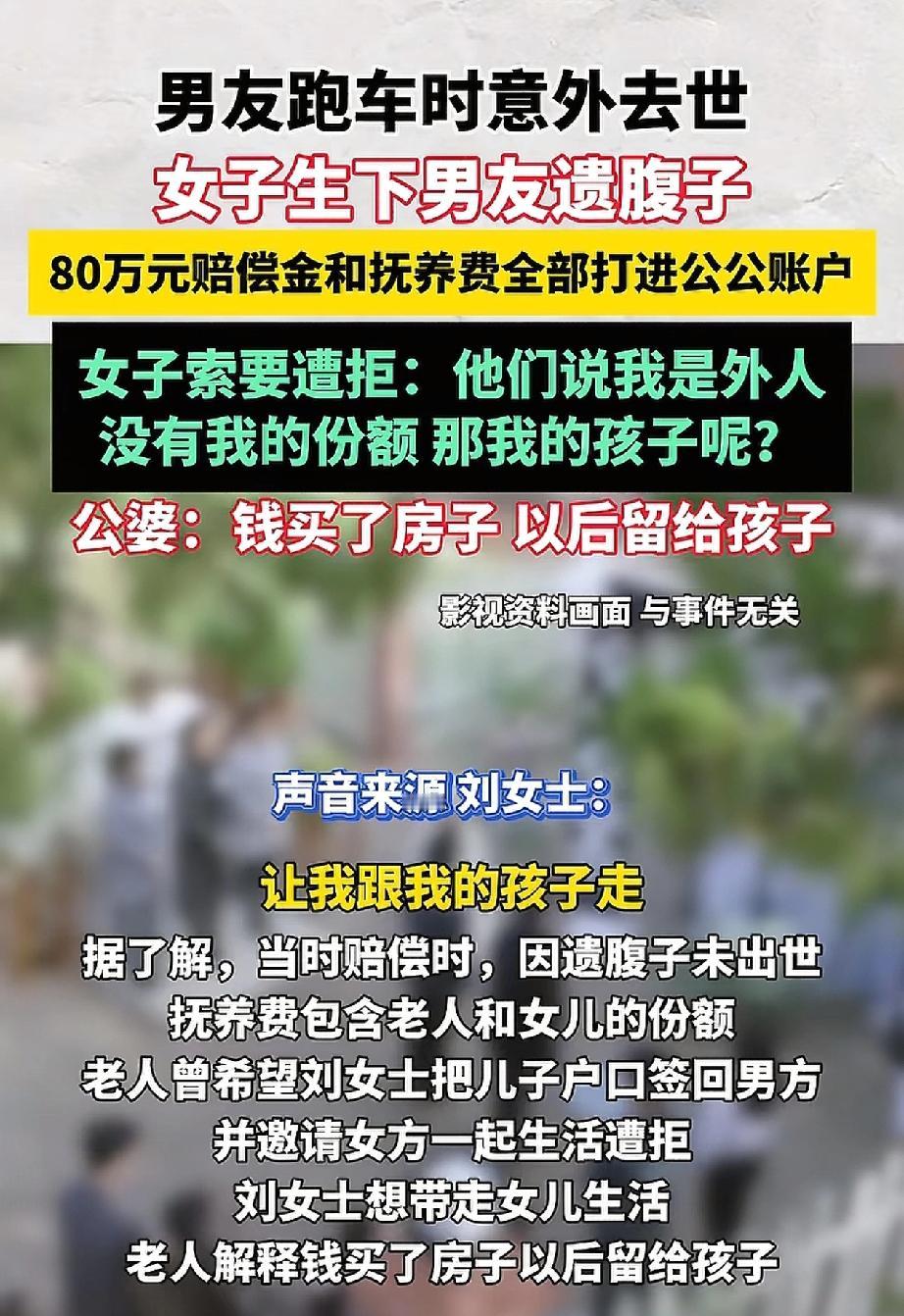 “怎么也没想到啊!”湖南,刘女士怀孕6个月,男友跑车出了意外。由于没有领证,赔偿的钱都打到了公公的账户里。女子想要回孩子的赡养费。公婆却说她是个外人。 刘女士和男友相恋两年,期间他们生育了一个女儿。本来幸福美满的生活着,日子也随着二人的经营越来越好,于是他们决定要二胎。 没想到意外就在这时悄然而来,刘女士怀孕6个月的时候,男友在外面跑车出了意外,不幸离开了人世。 经过赔偿,刘女士一家得到了80万元的赔偿和抚养费用。但是这些钱都打进了公公的账户里。 女子生下了二胎,遗腹子子是个男孩。如果没有这个意外,这个家庭是多么的幸福啊。 刘女士因为照顾孩子没有工作,没有经济来源,想着和公公婆婆要孩子的赡养费。公公婆婆说她是个外人,没有她的份额。刘女士问及孩子的那部分份额时,公公婆婆说这笔钱给孩子们买了房子。 公婆希望刘女士能够带着孙子回来和他们一起住,将来房子留给孩子。刘女士不愿意想带着孩子自己生活。 此事引起网友热议,有网友说:“我觉得老人做法没什么问题,人家钱买房子了,留给孩子,也愿意养孩子,说明人家要的不是钱,是孩子。女方拿着钱走了再找一个嫁了,孩子管别人叫爸,孩子跟老人再断绝来往那老人算什么,自己孩子没了,钱也没了。” 还有网友说:“应该给予一定补偿 孩子的是孩子的 两码事 人家能生就挺不错了。” 也有网友说:“未结婚,孩子当时未出生,并无财产纠纷,不给合理。” 其实,在赔偿的时候就应事先说明情况,这部分赔偿金应该怎么分配?这样就不会有后面的这些麻烦。 爷爷奶奶的做法也对。他们是想给儿子遗留下来的孩子一个保障,也是希望自己的孙子孙女将来有个依靠。 对此你有什么看法?