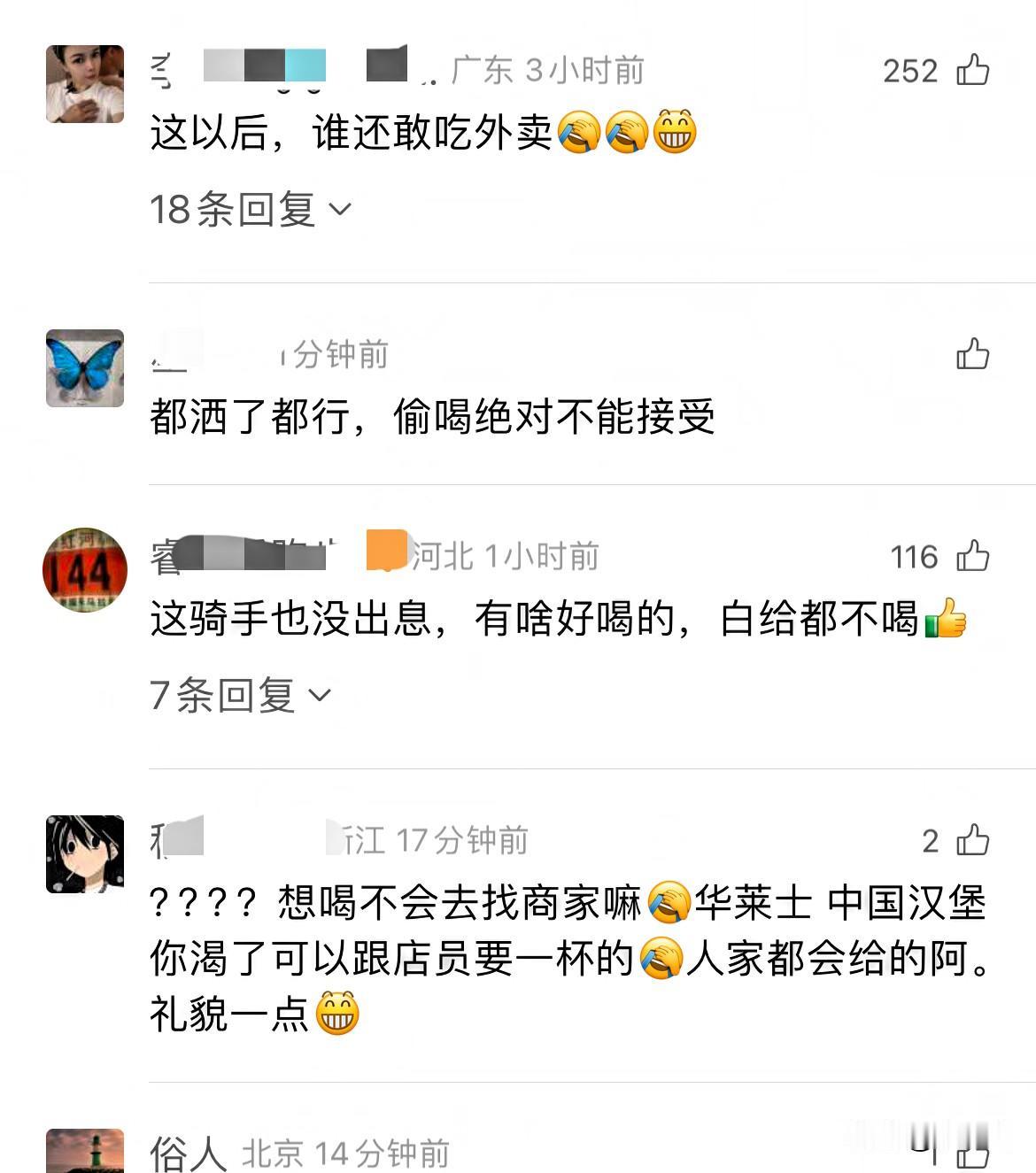 这谁能想到!山东日照,外卖员给女子送饮料,女子收到饮料后感觉“不对劲”,于是调查监控,发现原来是外卖员偷喝。女子一气之下投诉了外卖员,然而最后处罚让女子不满! 遇到这样的事,谁能不生气呢?外卖员偷喝自己的可乐,一点职业道德都没有,想想都觉得恶心啊! 据女子回应,这个外卖员只是不能在这个平台干了,还可以去别的平台工作,而且更让人生气的是他拒不道歉,也不赔偿! 女子非常气愤,于是选择曝光了这件事! 其实大多数外卖包装都是封住的,咱们消费者如果遇到没封口的,可以选择拒收,毕竟谁点个外卖,也希望是安全卫生的。 我认为这个外卖员也是没出息,一杯饮料值得吗?现在葬送了自己的职业生涯,以后怎么在服务行业混呢?这种毫无职业道德的人,就应该严惩,免得祸害其他顾客。 关于外卖员偷喝顾客饮料这件事,大家怎么看呢? (信息来源:搜狐新闻)